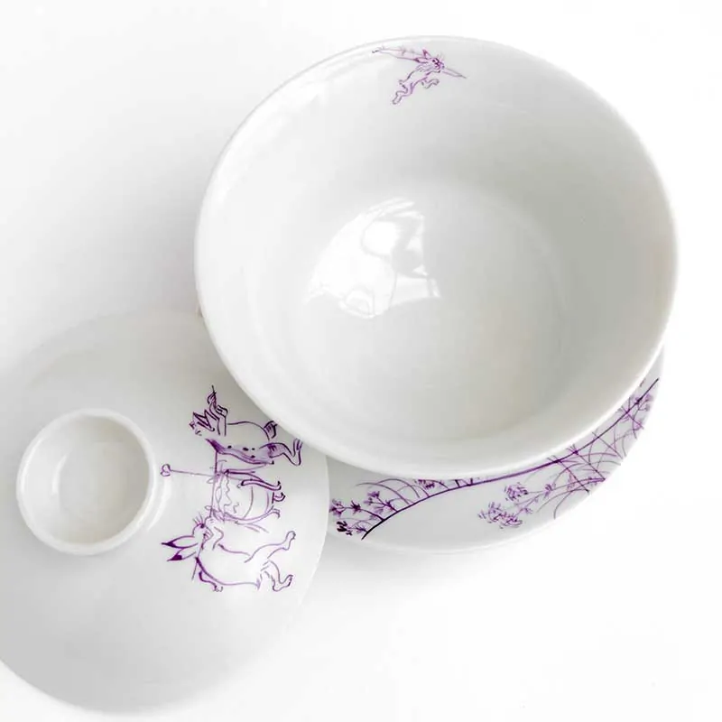 Handmade and hand-painted porcelain gaiwan from Kawai Masamitsu. The picture on the gaiwan is from the "Chōjū-Giga", the oldest remaining manga. It is painted with deep purple, the color of nobility and virtue in Japan. This color was also associated with gods, the Emperor, and the highest-rank priests.