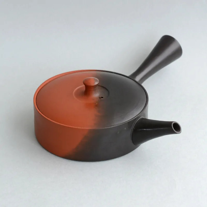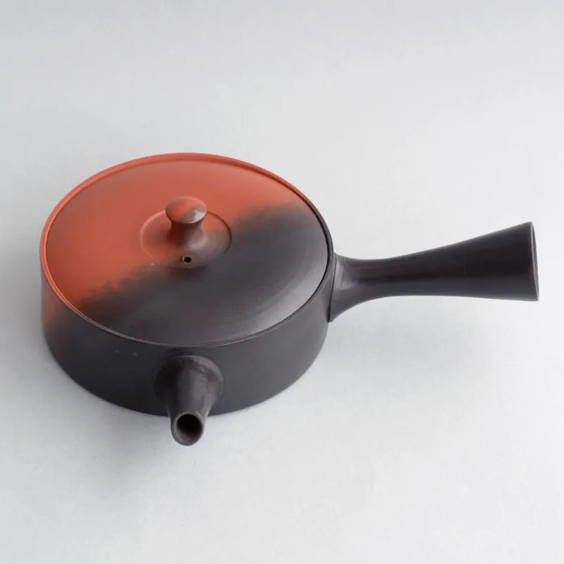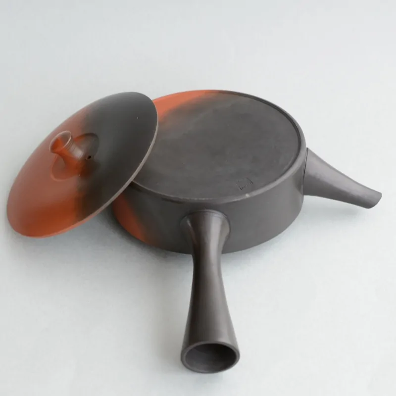 The teapot has yōhen finish. Yōhen in Japanese means "changed by the flame". When the teapot is fired, the heat fluctuates in the kiln, which results in color changes on the surface. This makes every piece unique with the impression of randomness, which has both aesthetic and philosophical appeal to the Japanese.