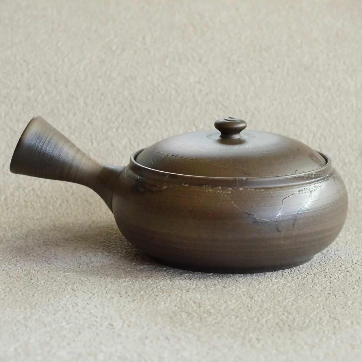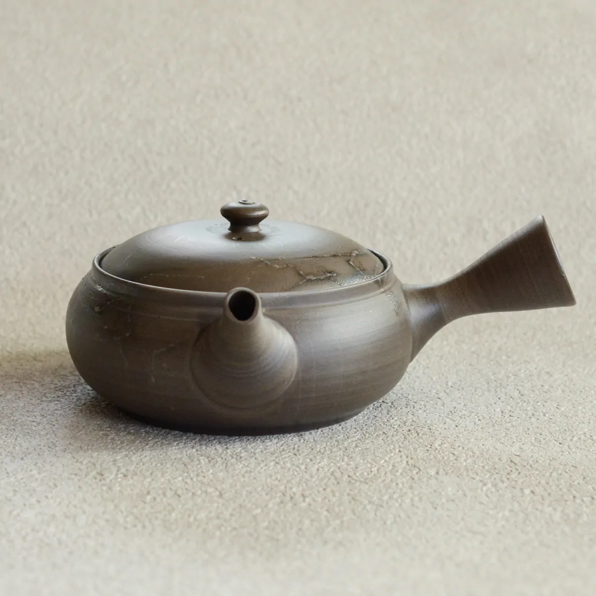 The teapot was fired in reduction chamber. The pattern on the surface is achieved with "Mogake technique" developed back in the 19th century. The pot was wrapped with Amamo seaweed, which reacts with the clay and oxidizes during firing. The result is this unique finish, bearing the impression of randomness, which has both aesthetic and philosophical appeal to the Japanese.