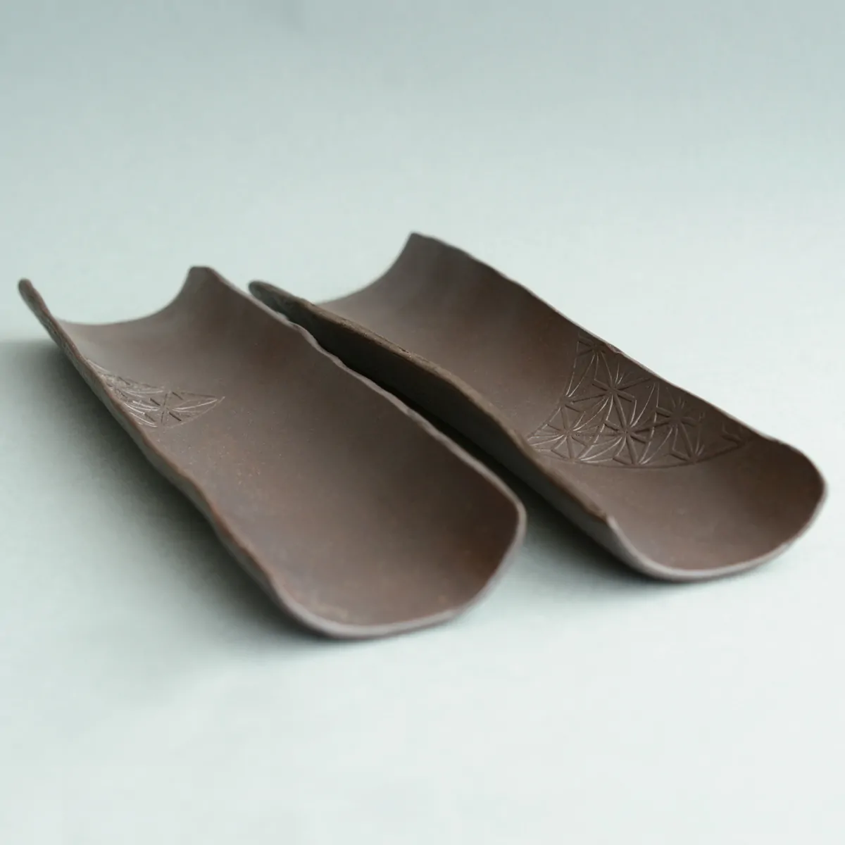 Glazed ceramic tea tool to display tea leaves before brewing. It is decorated with the traditional Japanese Asanoha (Hemp leaf) pattern engraved on the inside and textile print on the outside.