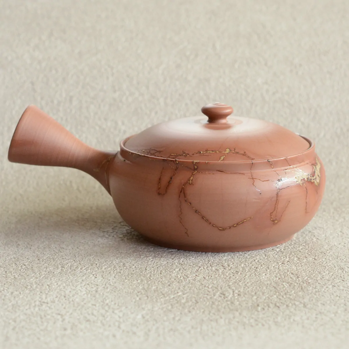 The teapot was made of white clay and fired in oxidation chamber. The pattern on the surface is achieved with "Mogake technique" developed back in the 19th century. The pot was wrapped with Amamo seaweed, which reacts with the clay and oxidizes during firing. The result is this unique finish, bearing the impression of randomness, which has both aesthetic and philosophical appeal to the Japanese.