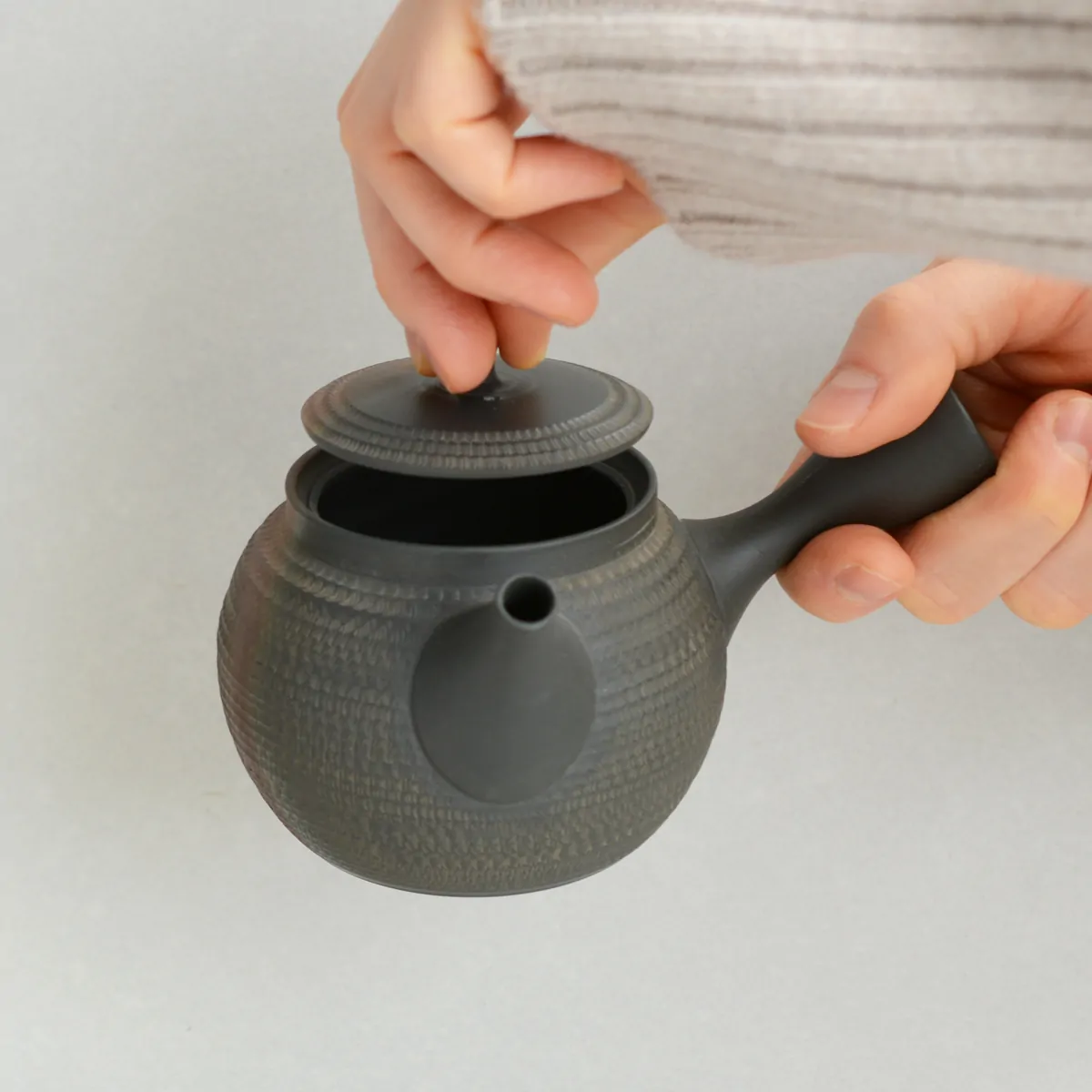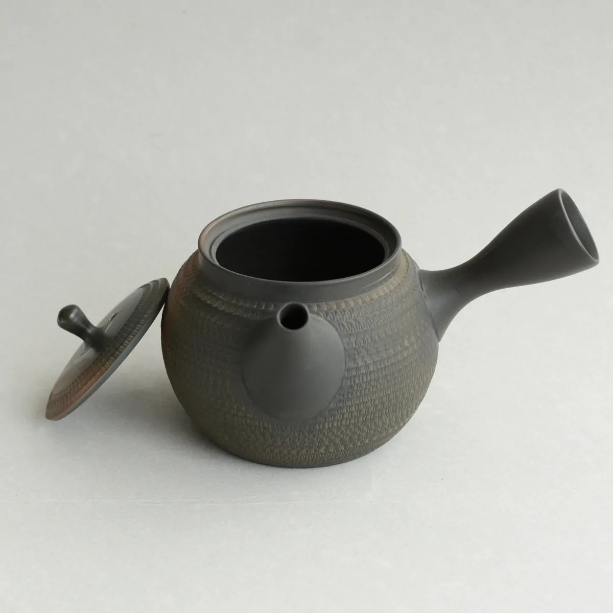 The teapot was fired in a reduction chamber, where the clay carbonizes and gives the surface a matte black patina.