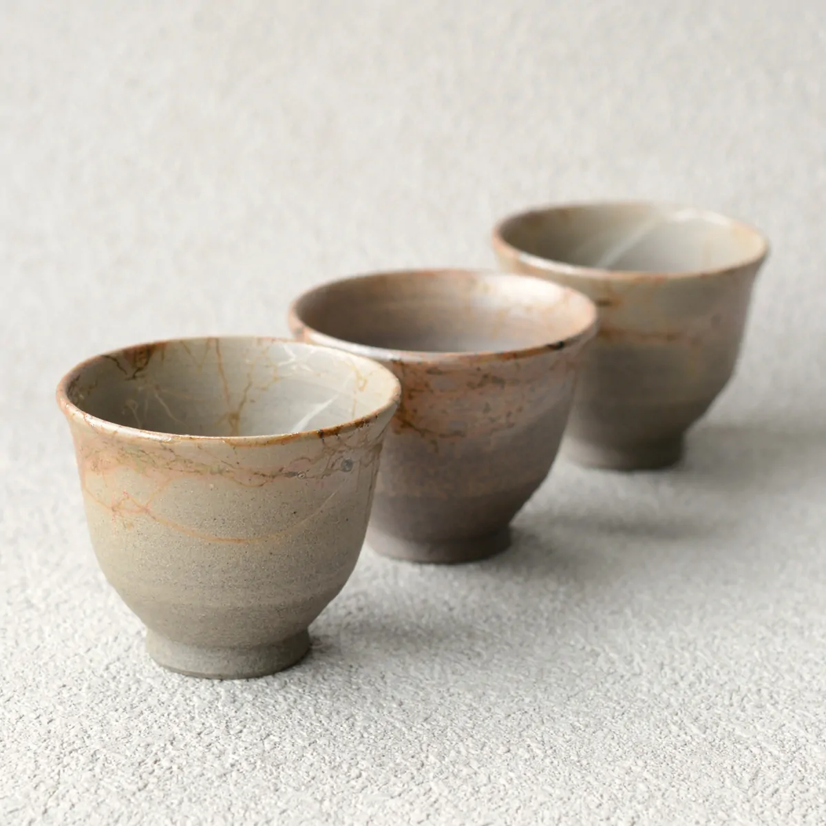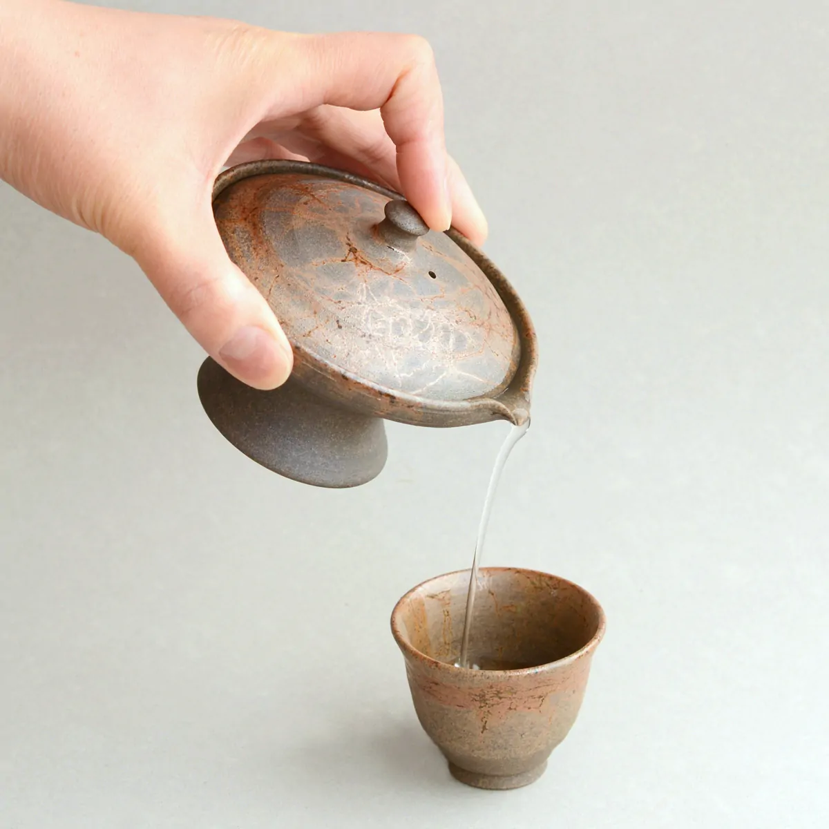 The tea cup is made of white clay and fired in a reduction chamber for over a day. The reduction firing turns the clay brownish. The pattern on the surface is achieved with "Mogake technique" developed back in the 19th century. The teapot is wrapped with Amamo seaweed, which reacts with the clay and oxidizes during firing. The result is this unique pattern, bearing the impression of randomness, which has both aesthetic and philosophical appeal to the Japanese.