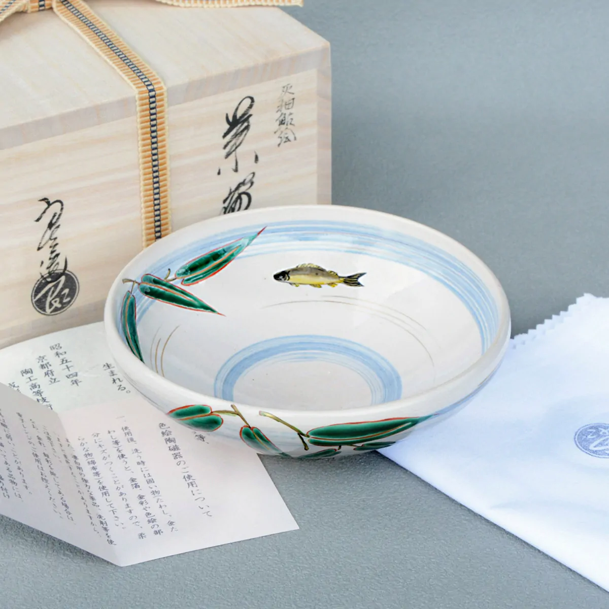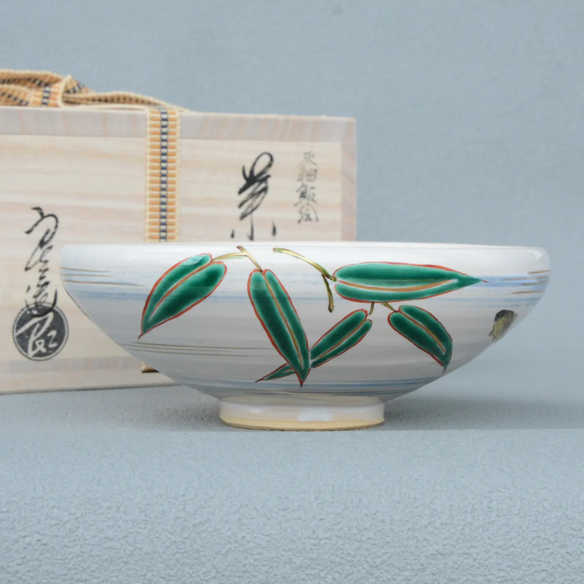 Matcha bowl for summer coated with ash glaze. "Hira" chawan are flat and wide, commonly used in summer, because thanks to their shape, matcha cools easier in them. Hira chawan are often decorated with summer motives, and Chawan Kaiyū Ayu is no exception. The light blue brush strokes immediately recall the faint color of summer waters, while sasa leaves and ayu fishes are popular summer symbols.