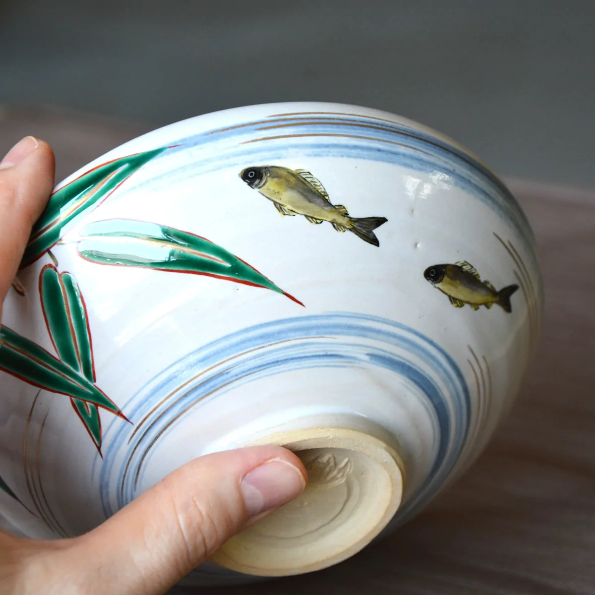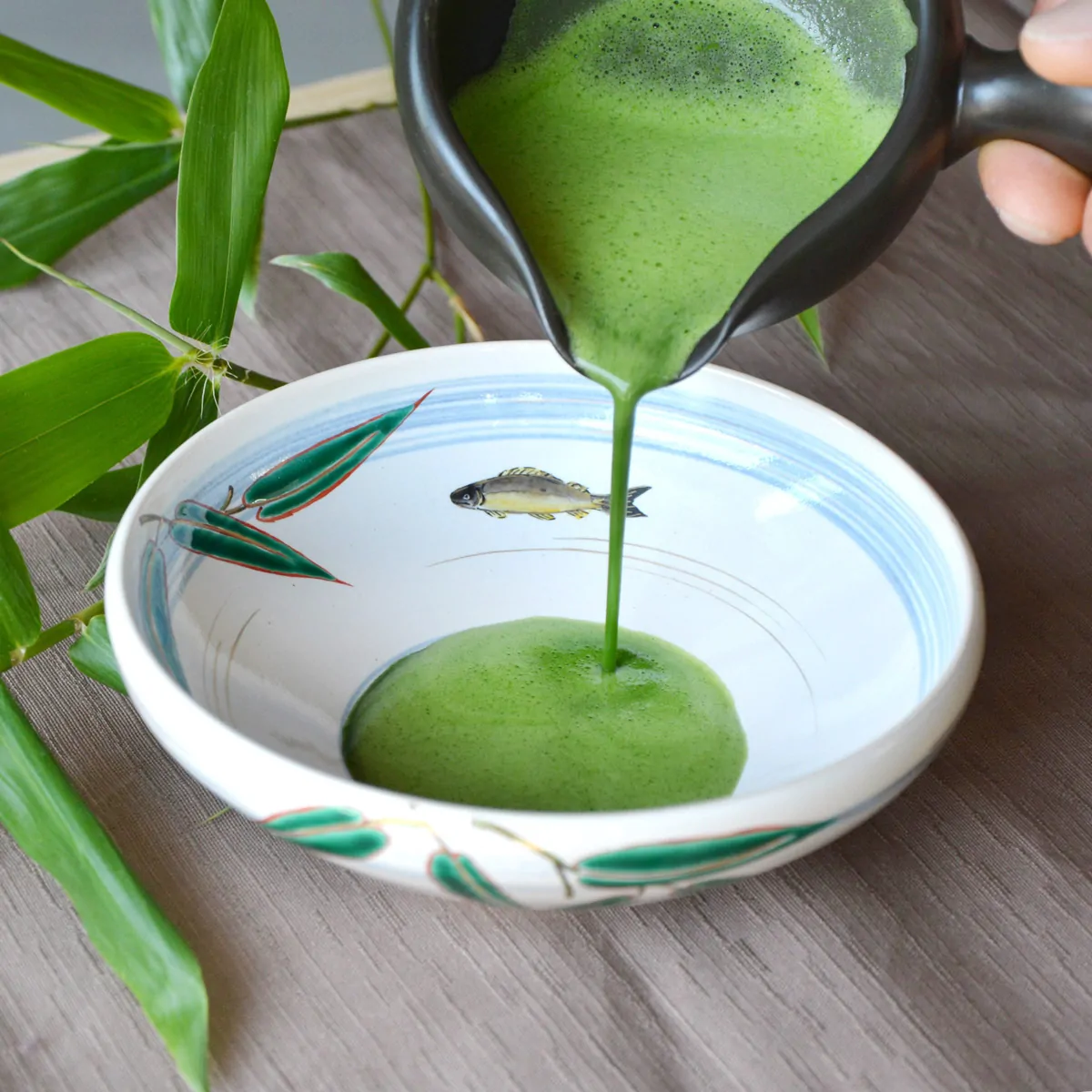 Handmade and hand-painted matcha tea bowl decorated with ayu sweetfish.