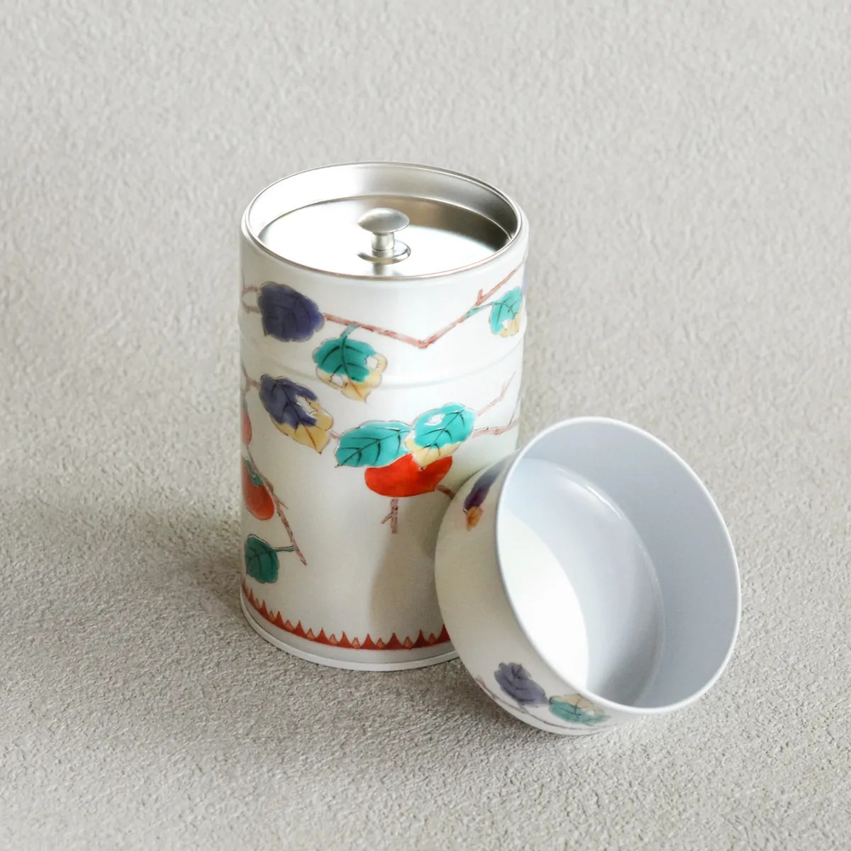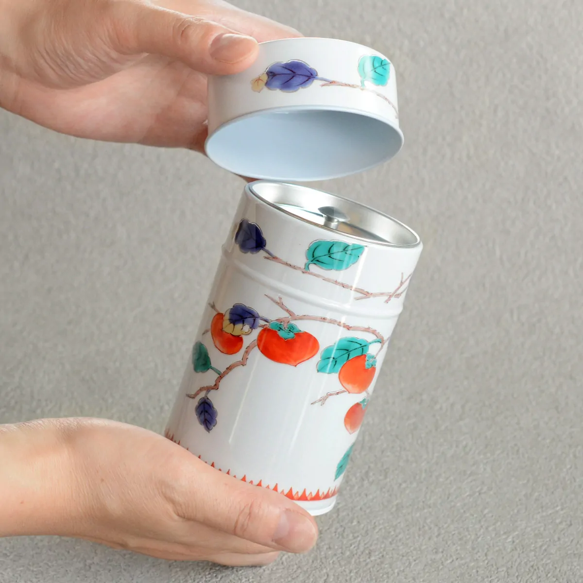 Steel tea container decorated with persimmons in the style of Arita porcelain paintings. The container is not airtight, but if you put your loose tea leaves in their original packaging into this caddy, it keeps fresh longer.