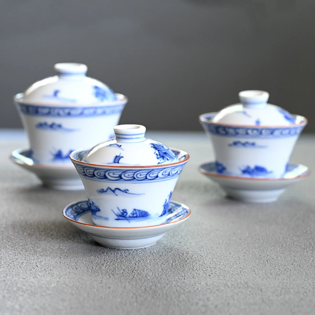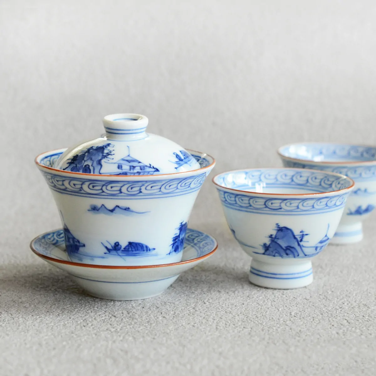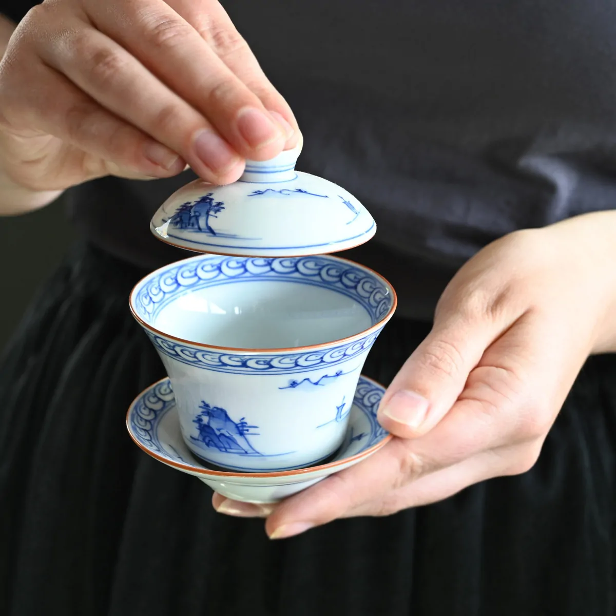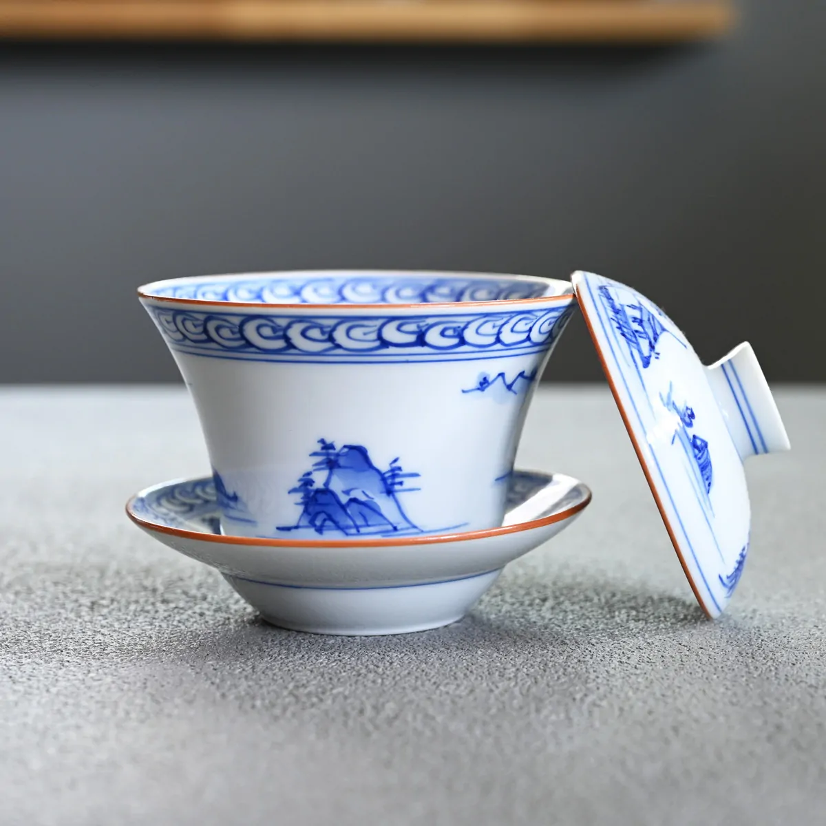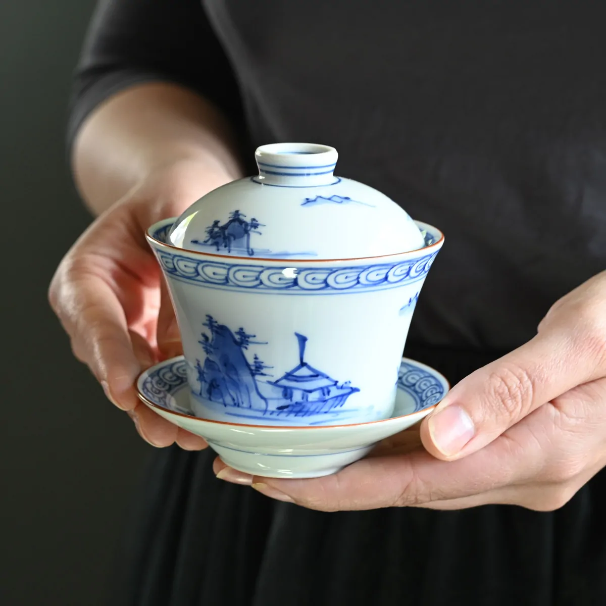 This handmade and hand-painted Hasamiyaki porcelain gaiwan features a serene landscape motif of mountains and water.