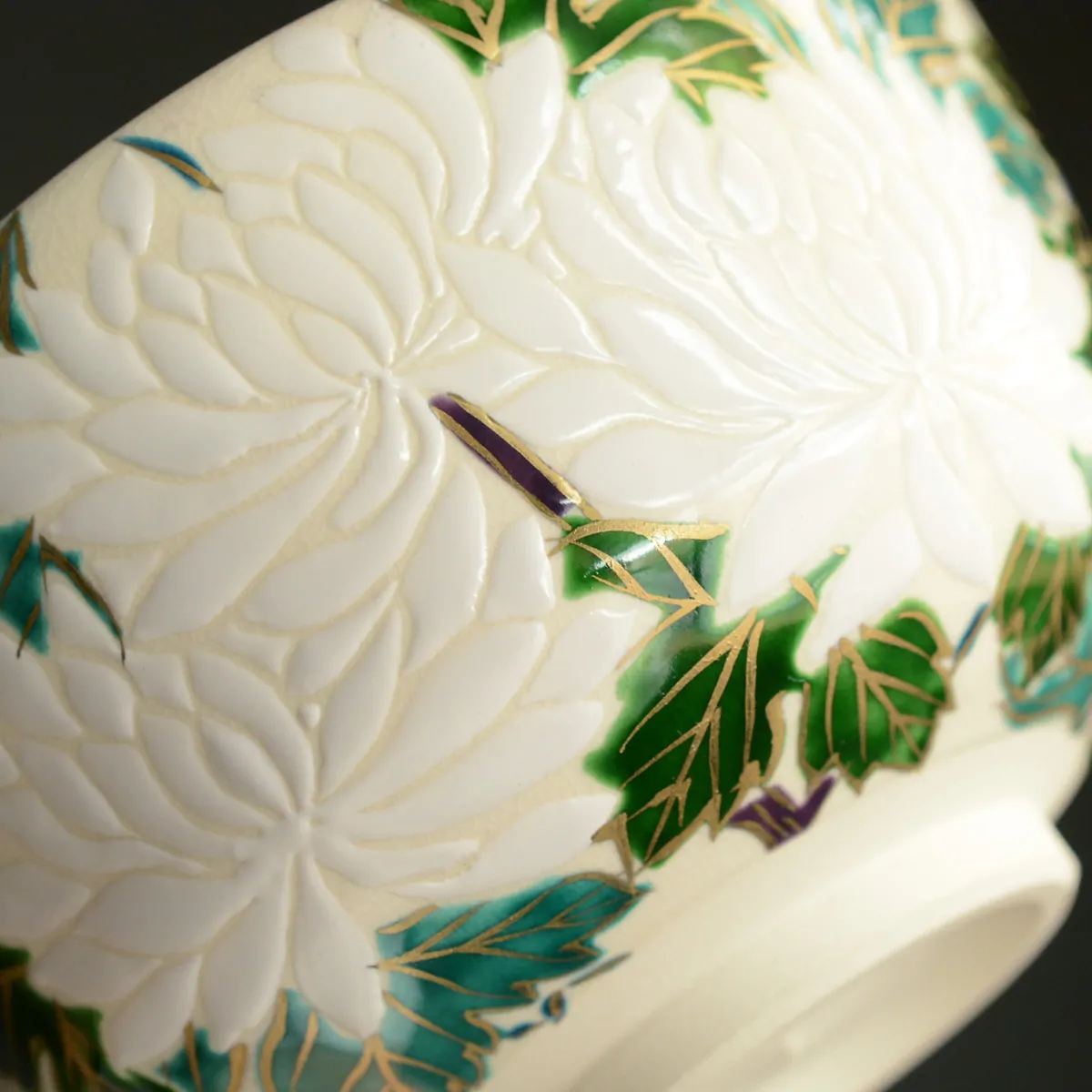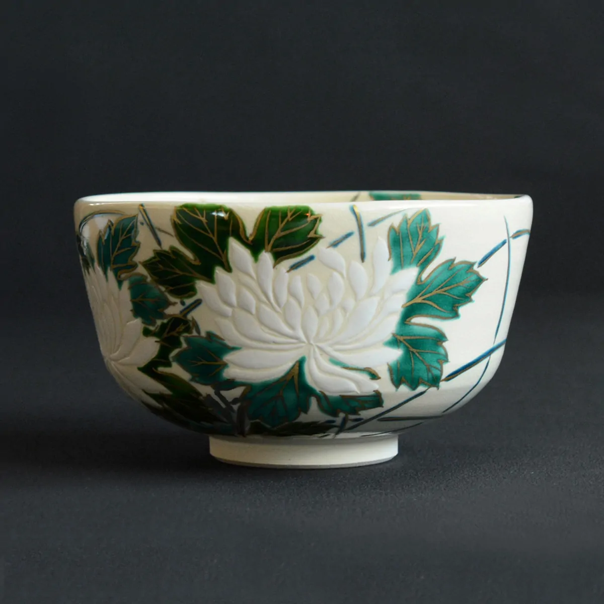 Handmade matcha tea bowl decorated with hand-painted chrysanthemum flowers. An exquisite artwork with a gorgeous, statuesque surface from Katō Josui.