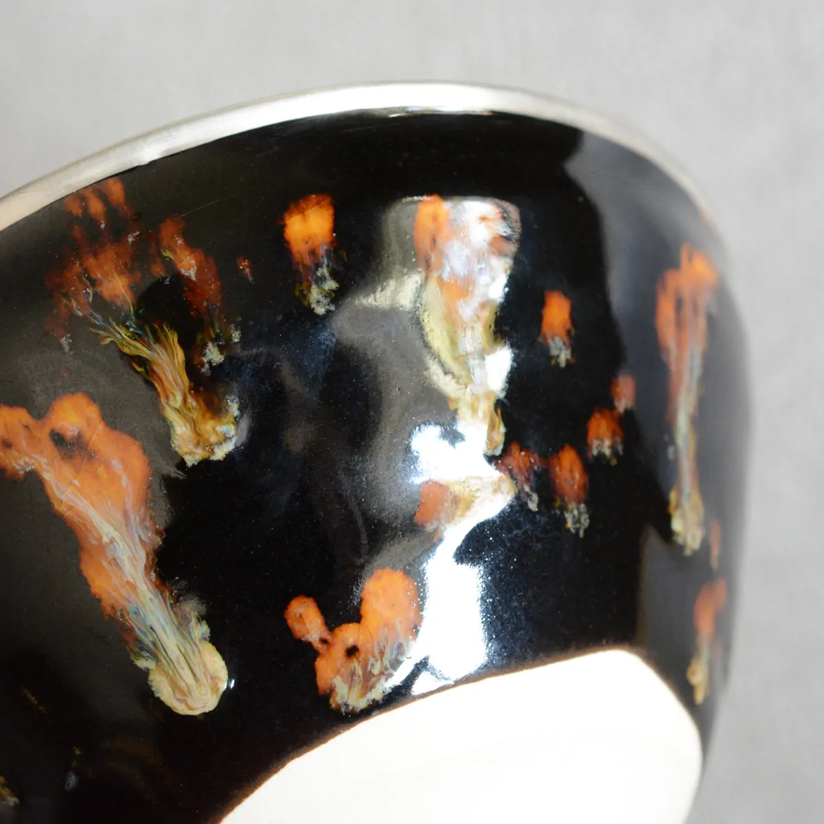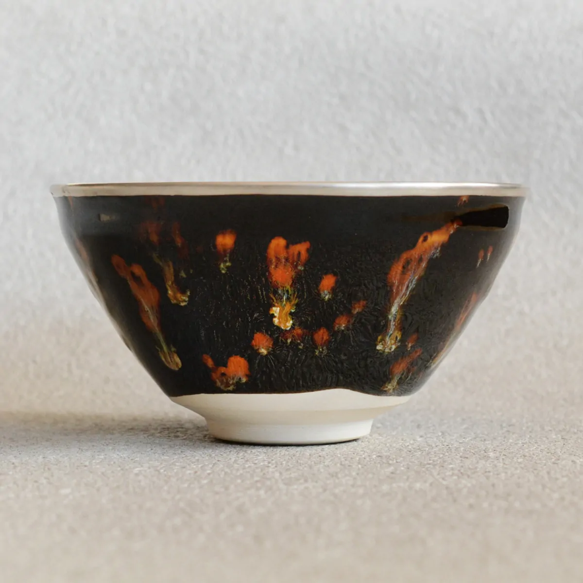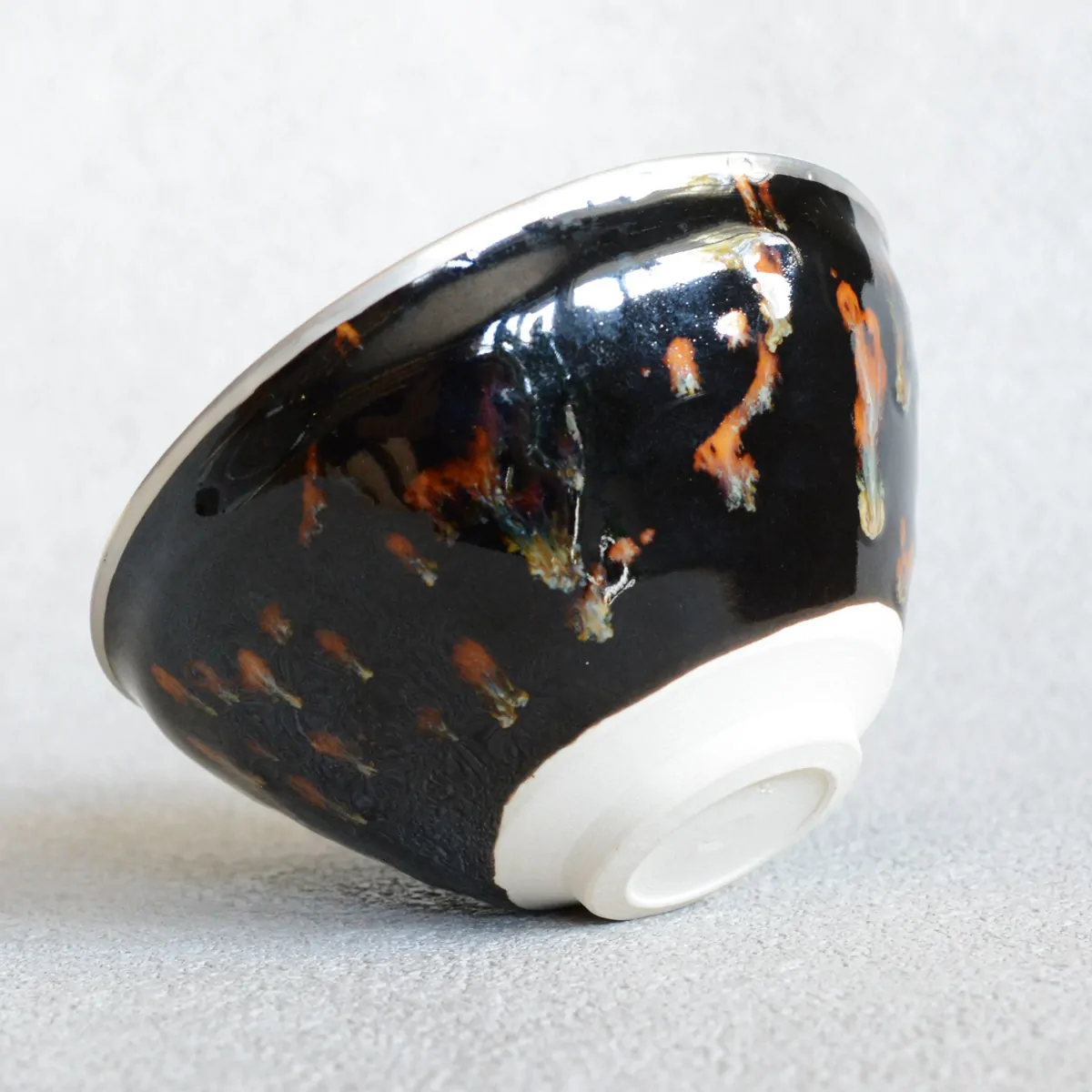 Tenmoku glaze got its name from a remote Chinese temple it was first used, on the Tianmu (Tenmoku in Japanese and Heaven's Eye in English) Mountain. From the 13th century, monks in this temple drank their tea from tea bowls glazed with a special technique called yuteki (literally meaning “oil drop”). Tenmoku glazes can range in color and pattern, which makes every glazed piece unique with the impression of randomness, which has both aesthetic and philosophical appeal to the Japanese.