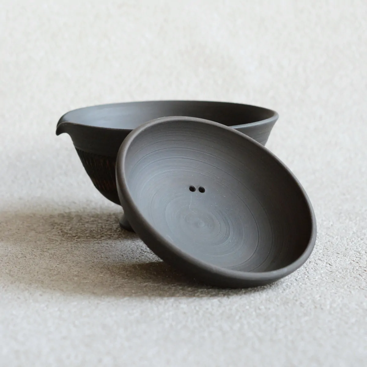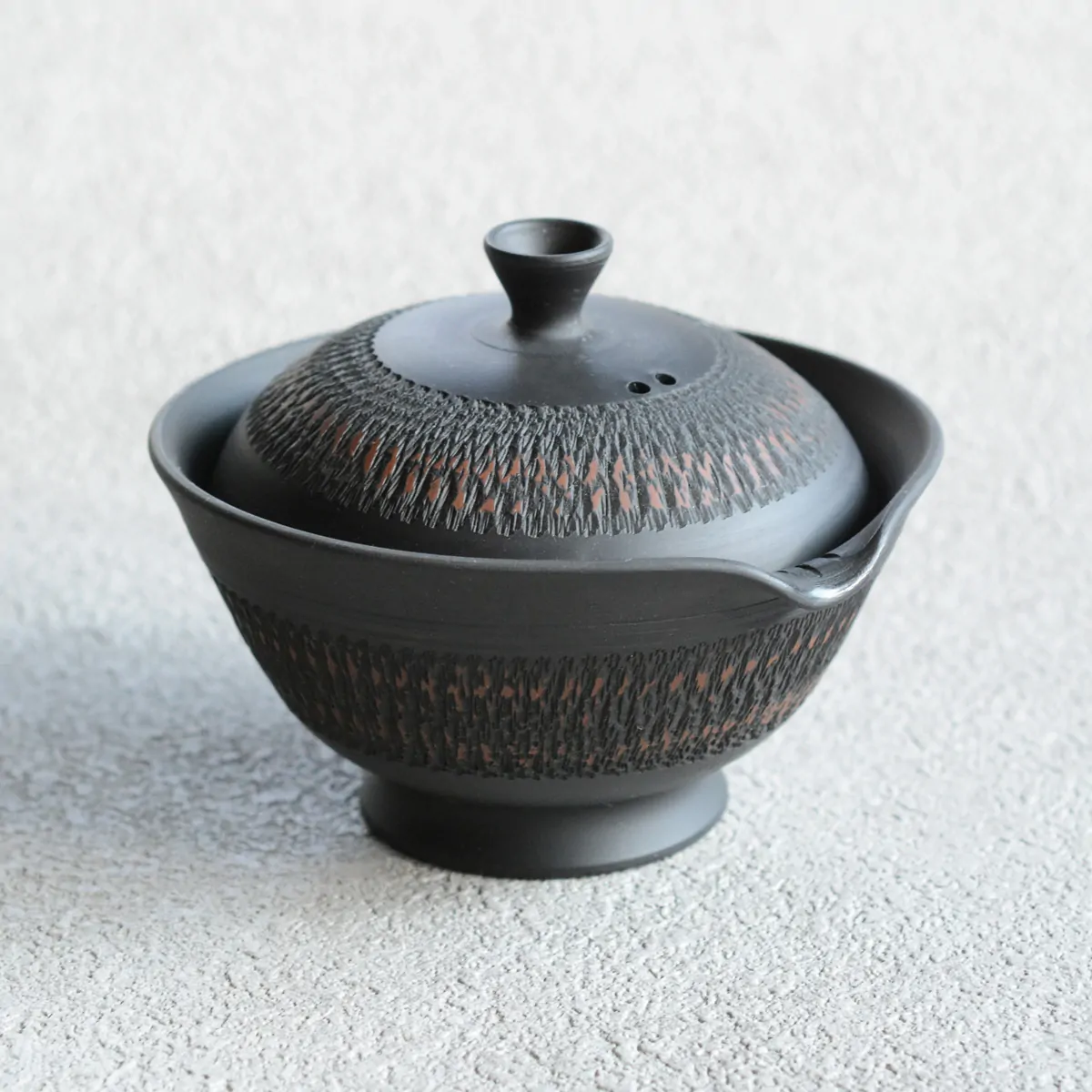 Red clay handless teapot fired in a reduction chamber, which gave the surface this matte black patina. It is decorated with "biri" - stamping decoration. On the "biri pattern", the black patina is polished back to reveal the red clay again and make the surface interestingly statuesque.