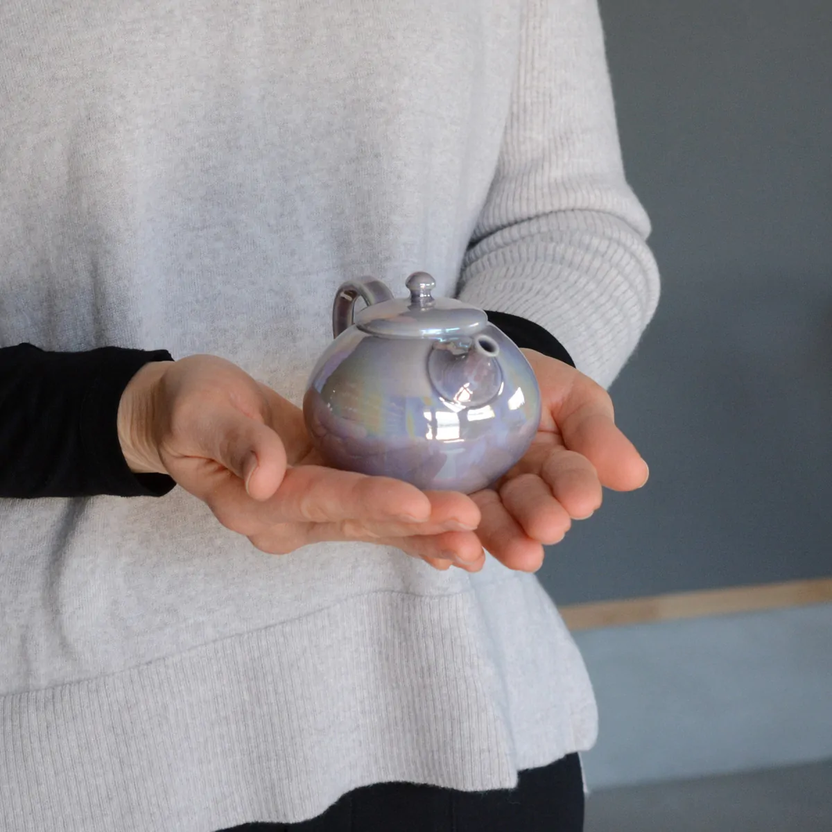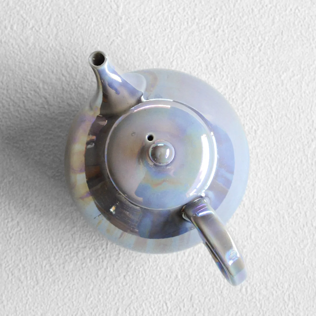 The teapot is made of white clay and as a beautiful final touch, it is coated with an amethyst color luster glaze on the outside. Inside it stays unglazed.