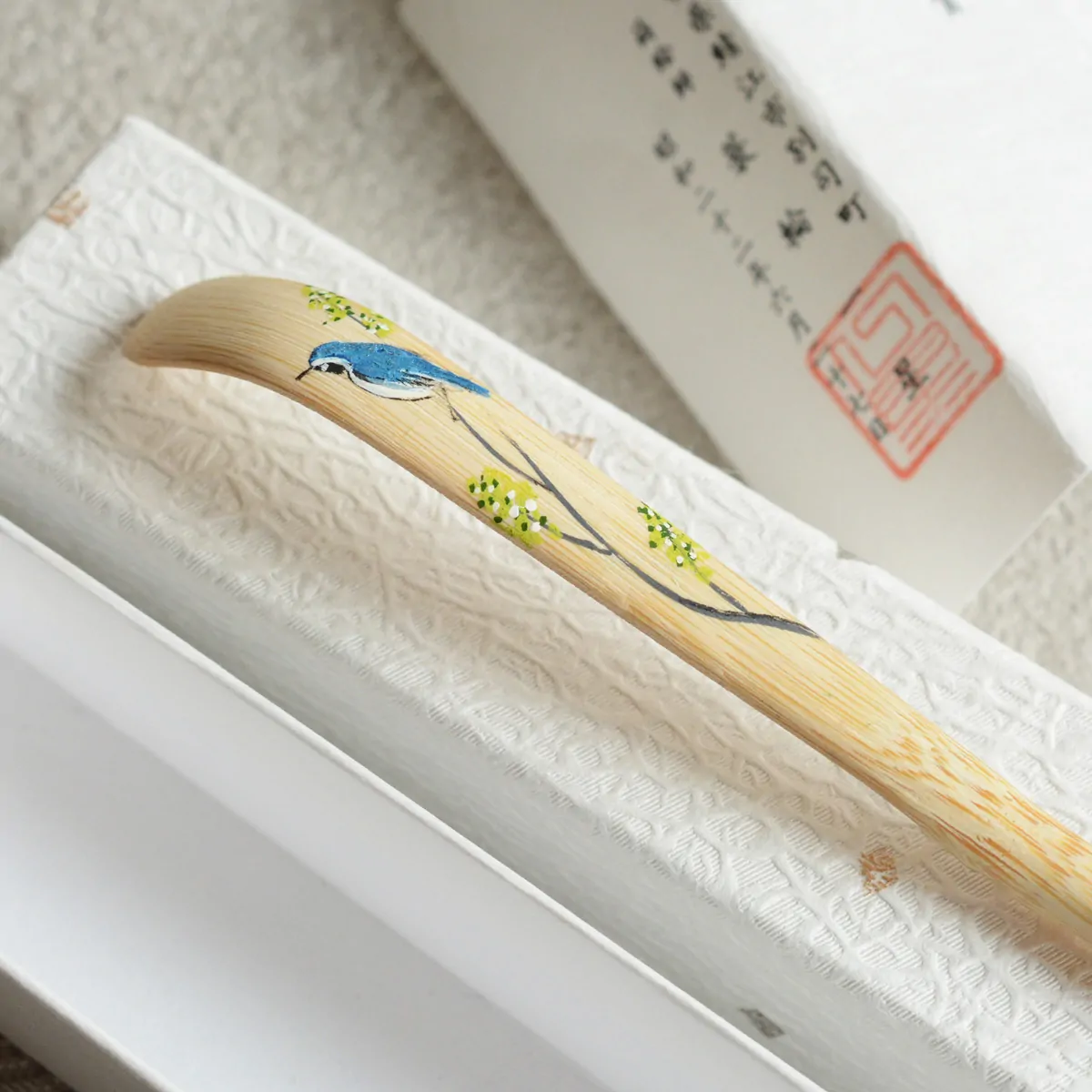 Handmade and hand-painted chashaku made of bamboo. Ōruri - Blue-and-white Flycatcher - is painted on the back of the scoop. This beautiful songbird is a herald of Spring as it leaves Japan in winter and returns in April.