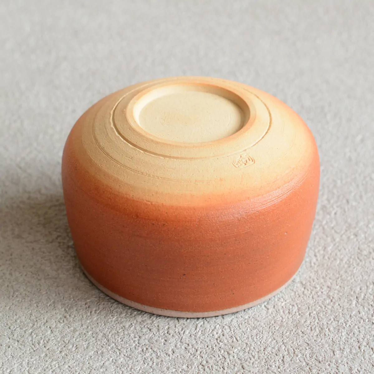 its so small and adorable! the colors remind me of a sunrise or a sunset, this bowl was nice for an outdoor temae in the garden in the very early spring morning. The foot of the bowl is interesting as it does not stand out yet it is still quite pronounced, and the texture is wonderful in the hands.