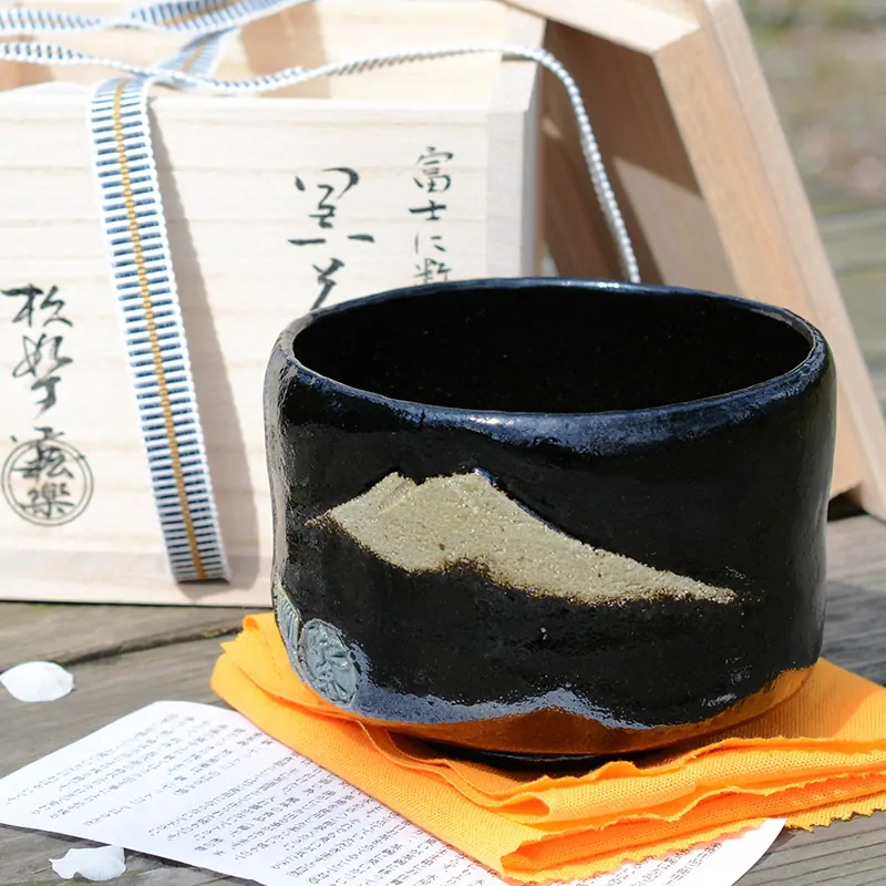 Kuro raku matcha tea bowl decorated with the abstract picture of the iconic Mt. Fuji. In Shinto Mt. Fuji is regarded as sacred and is one of the most popular pilgrimage sites.