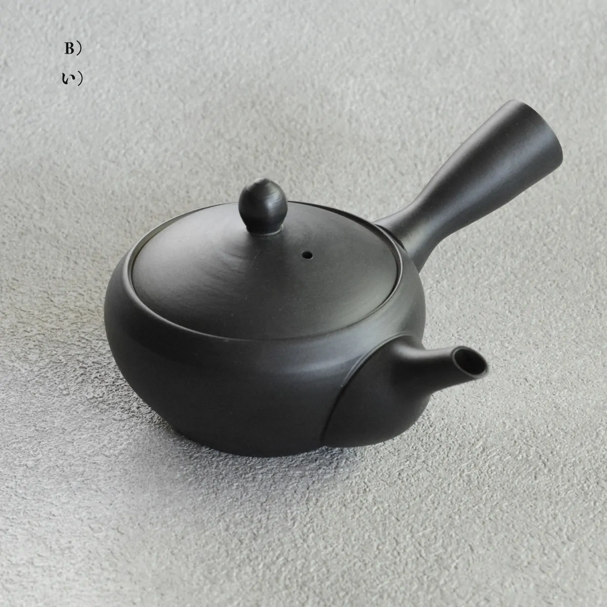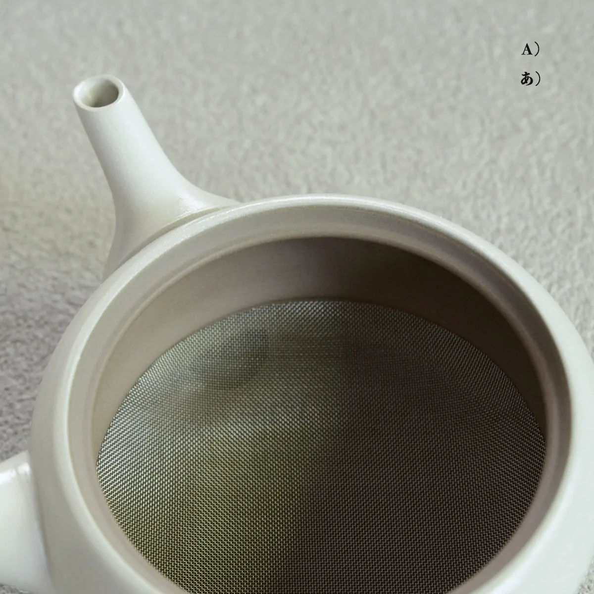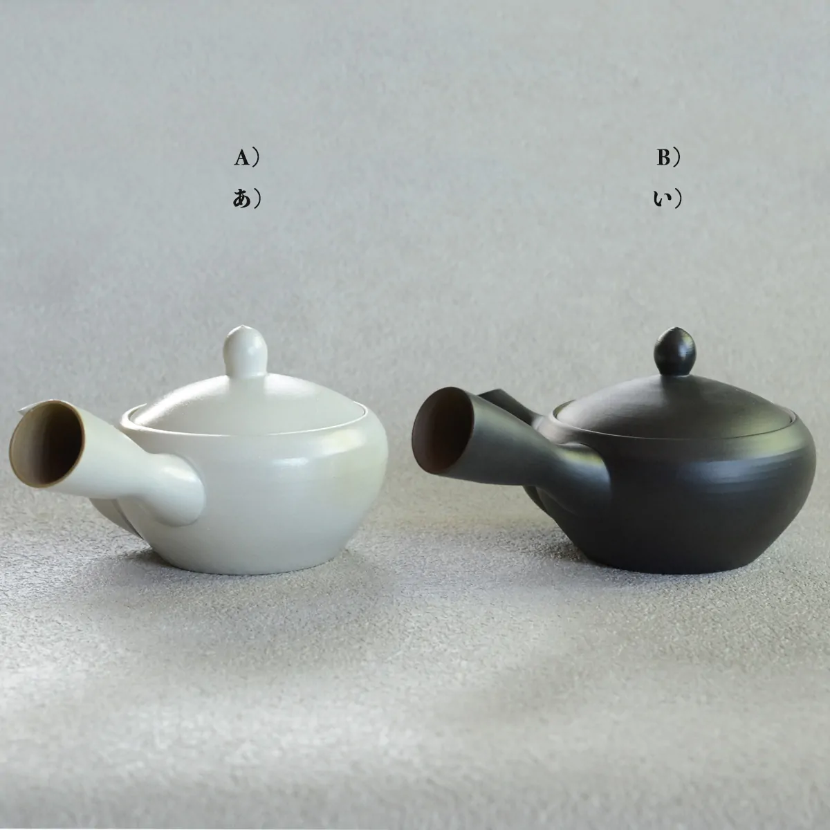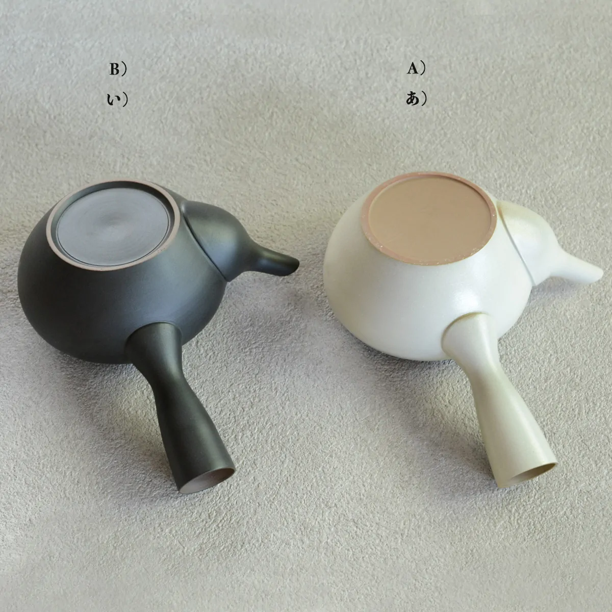 The teapot is made from white clay. It is unglazed on the inside and glazed on the outside. It comes in two glazing variations: white (A) and black (B).