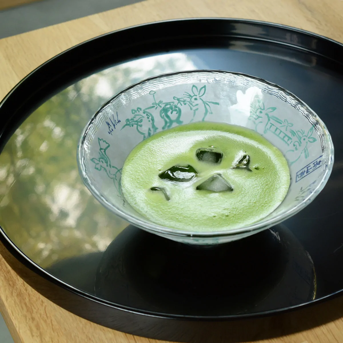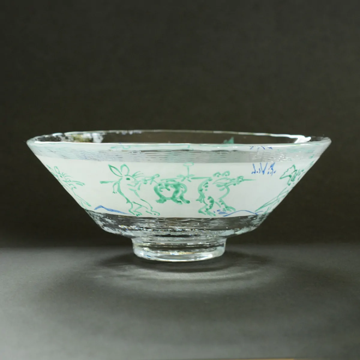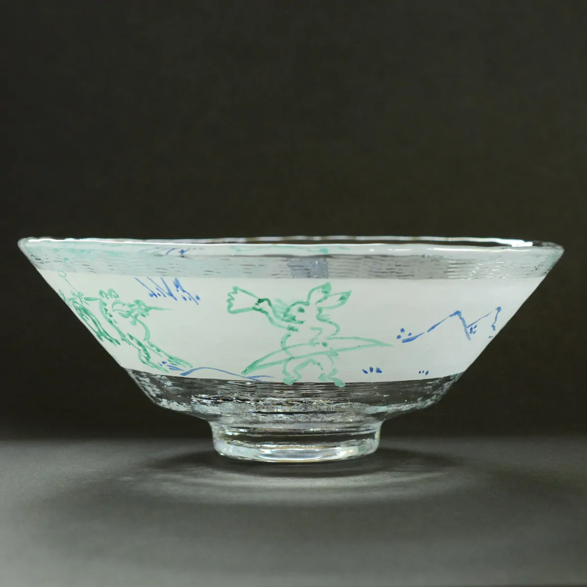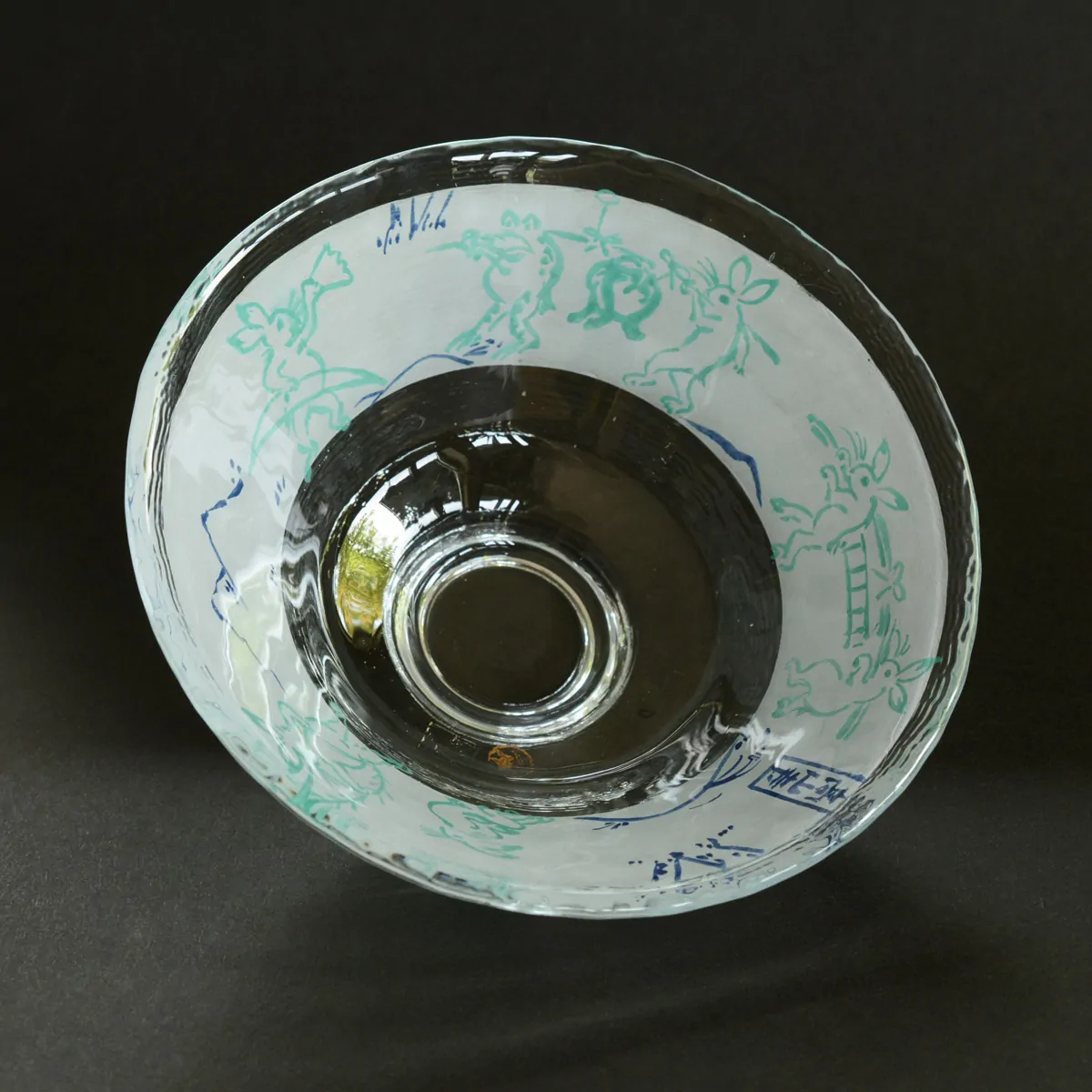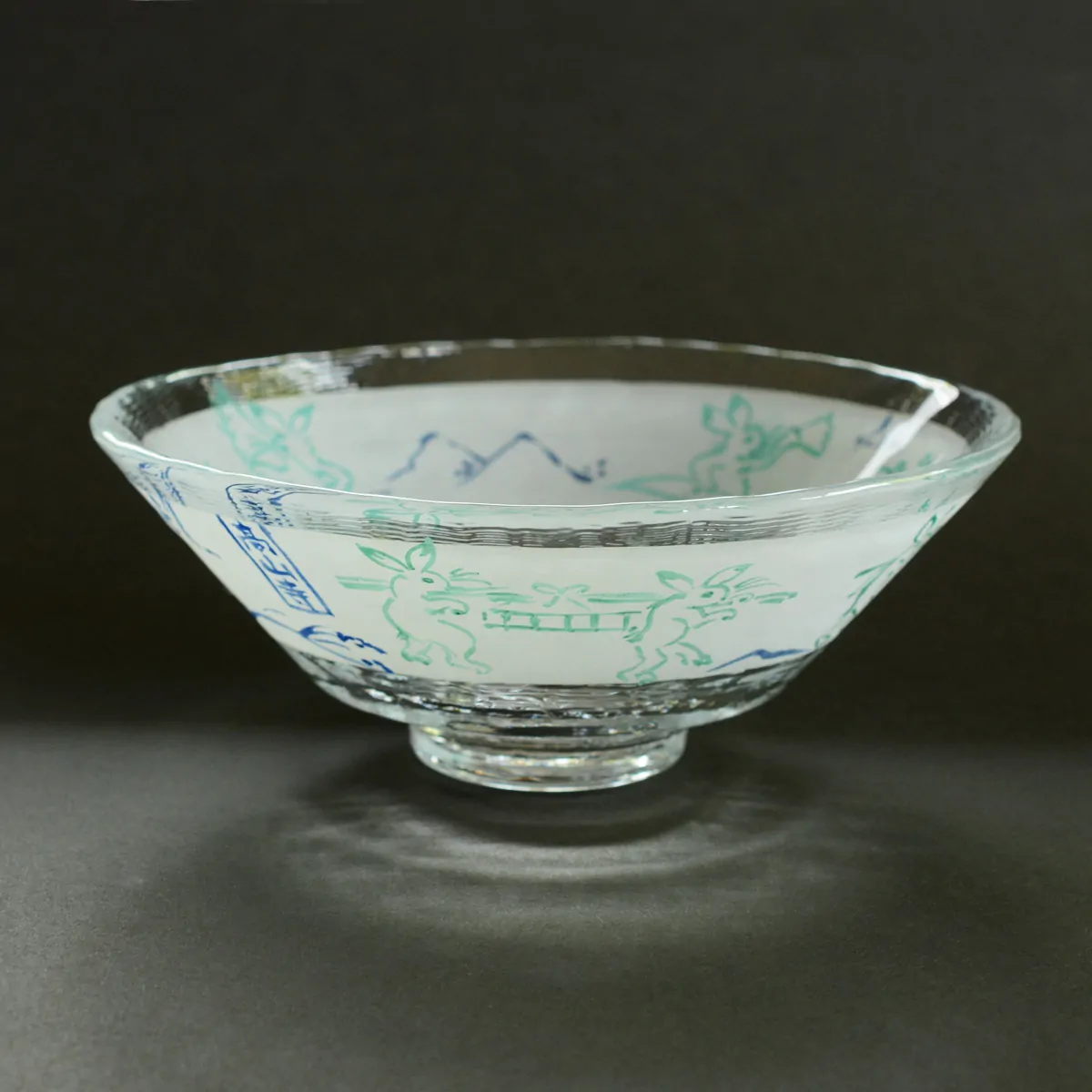 Handmade and hand-painted tempered glass bowl decorated with scenes of the oldest remaining manga drawings (Chōjū-jinbutsu-giga - “Scrolls of Frolicking Animals”).