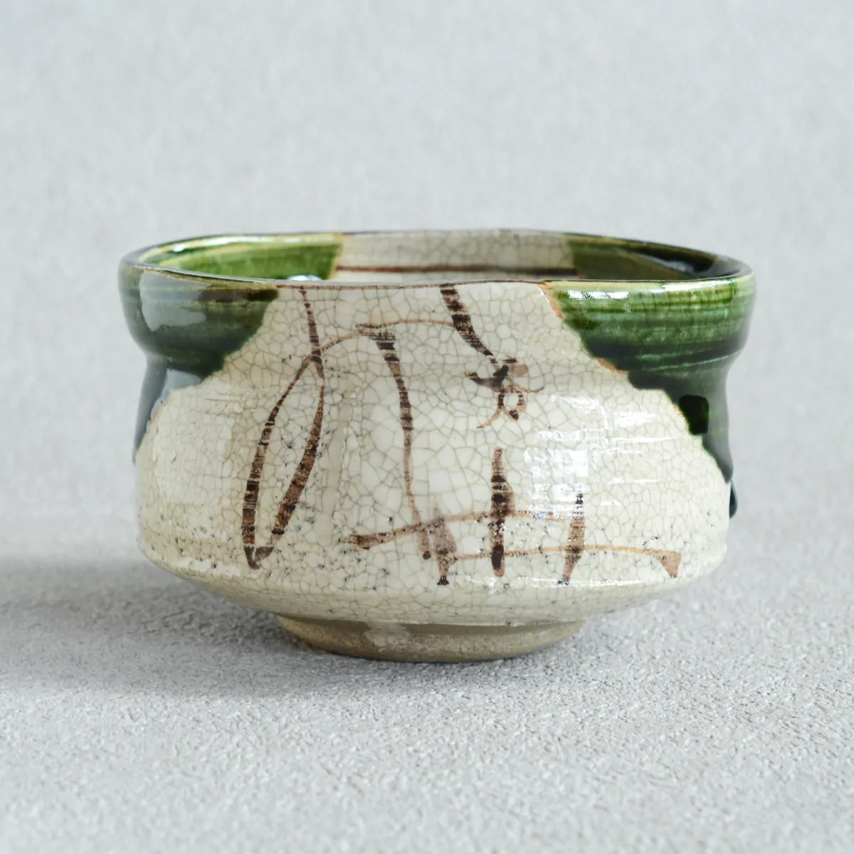 Oribe glazed handmade and hand-painted tea bowl from Matsumoto Tetsuzan.