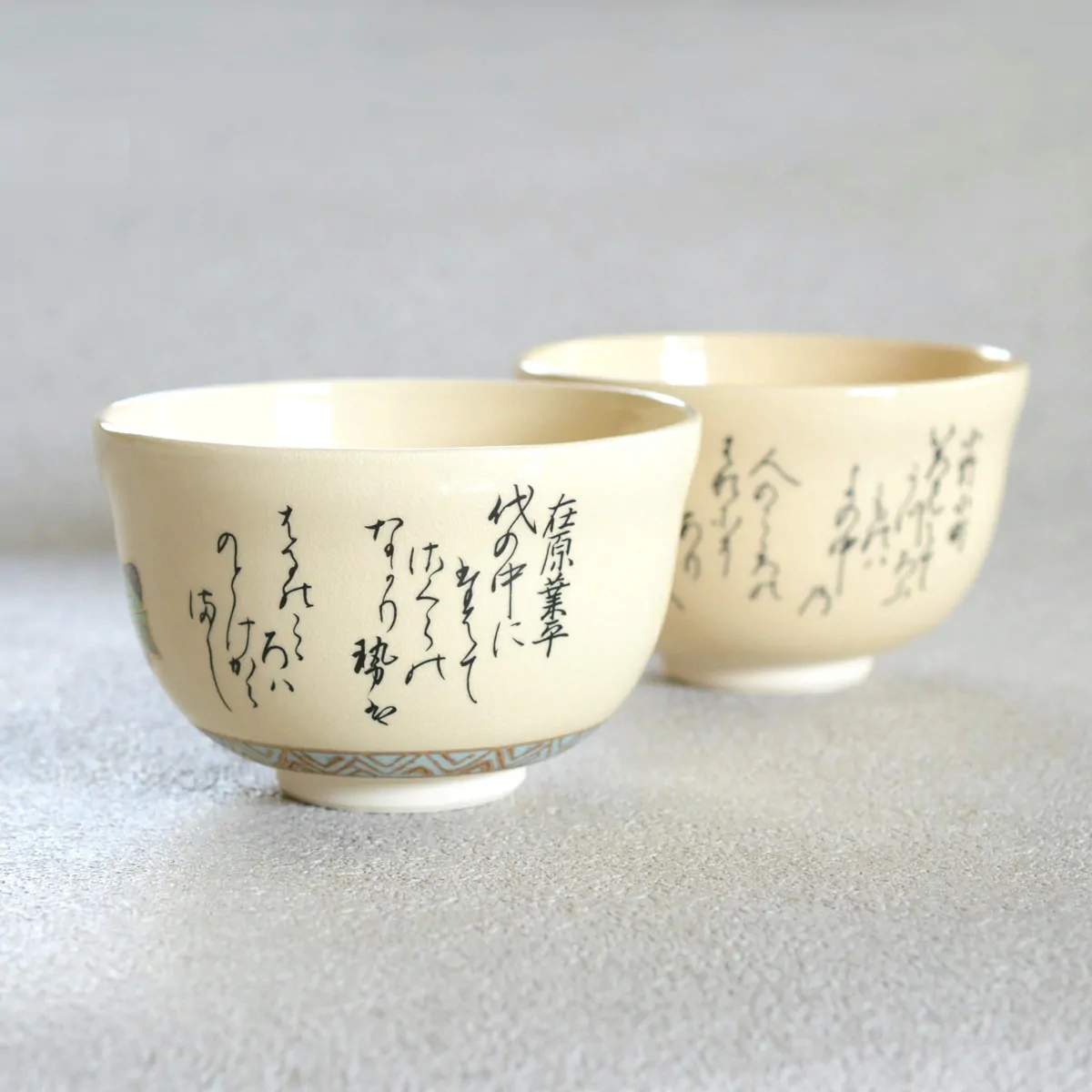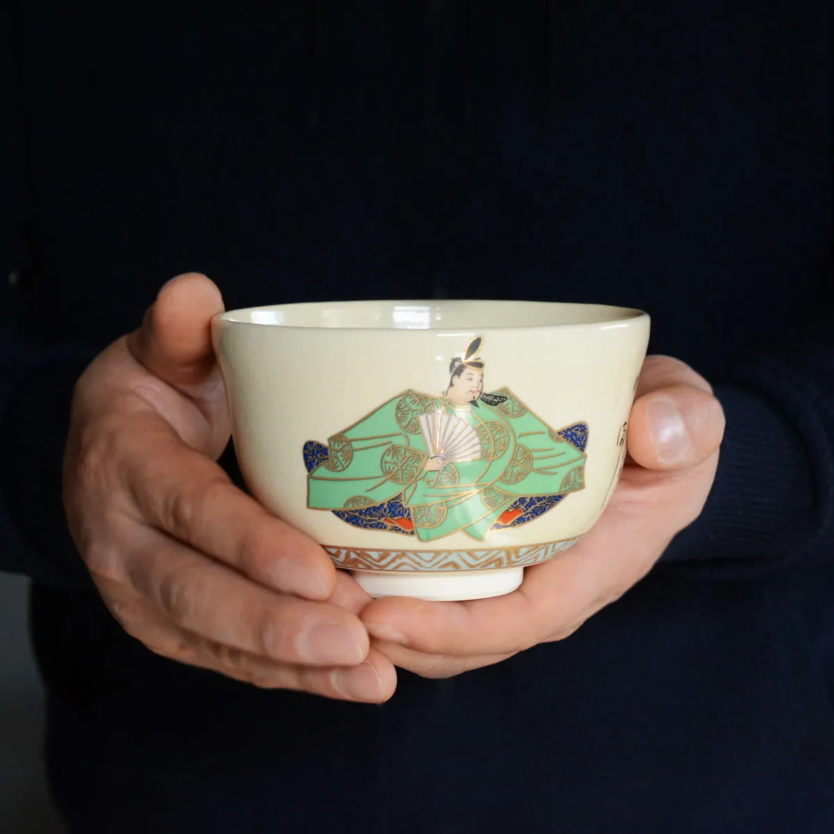 The characters on the two tea bowls are two famous Japanese poets. The male figure is Ariwara no Narihira, the female figure is Ono no Komachi, both among the best waka poets of the early Heian period (9th century). Their poetry is collected in the Kokin Wakashū ("Collection of Japanese Poems of Ancient and Modern Times"), a poetry anthology conceived by the emperor himself. The poets are wearing the typical Heian-era multiple-layered, colorful kimono.
