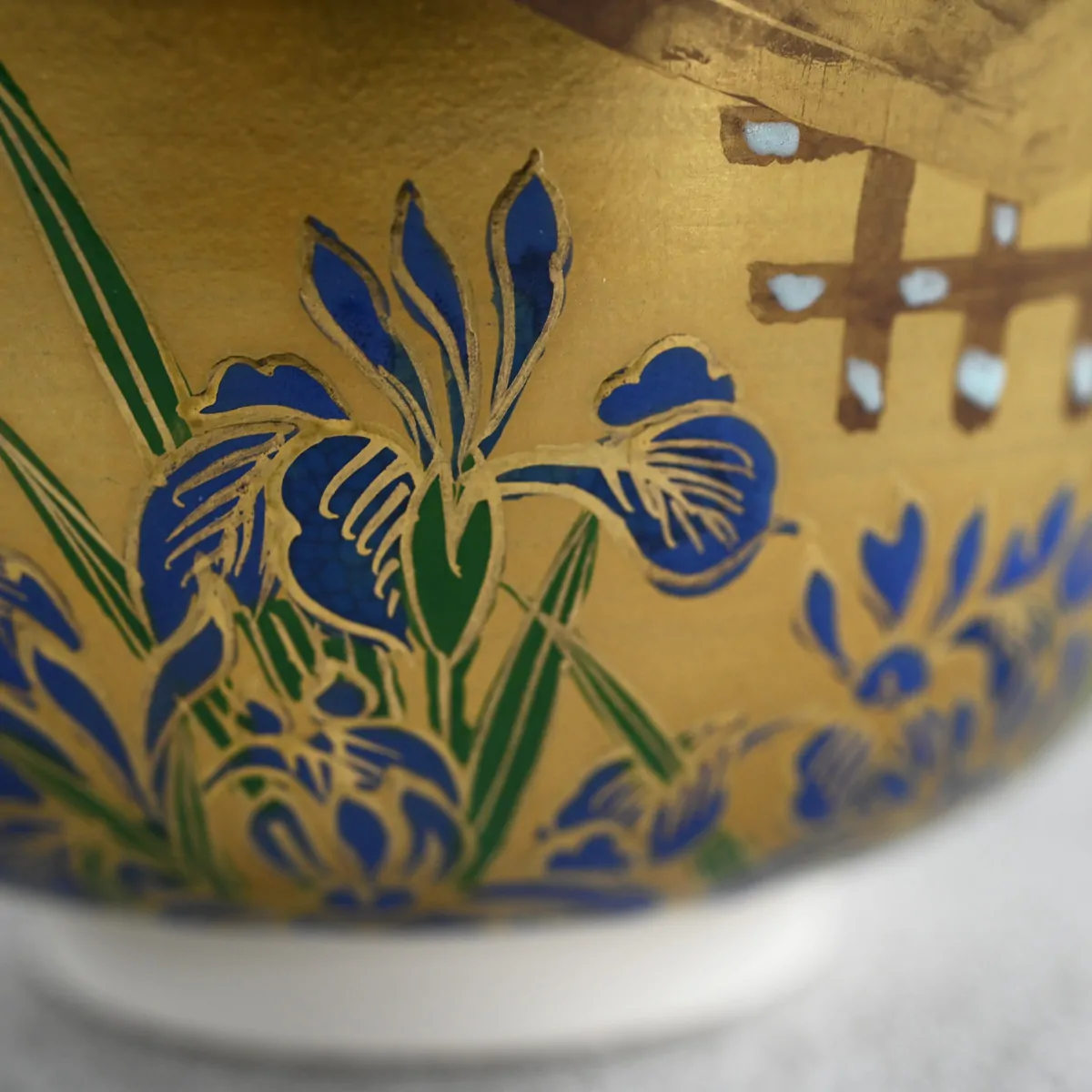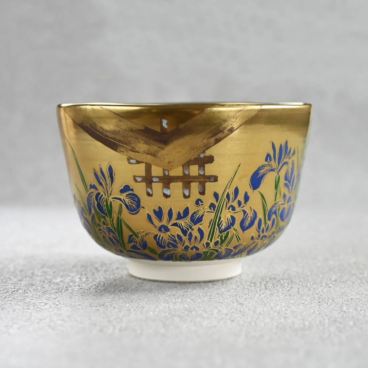 Handmade matcha tea bowl decorated with hand-painted iris flowers. An exquisite artwork with a gorgeous, statuesque surface from Katō Josui.