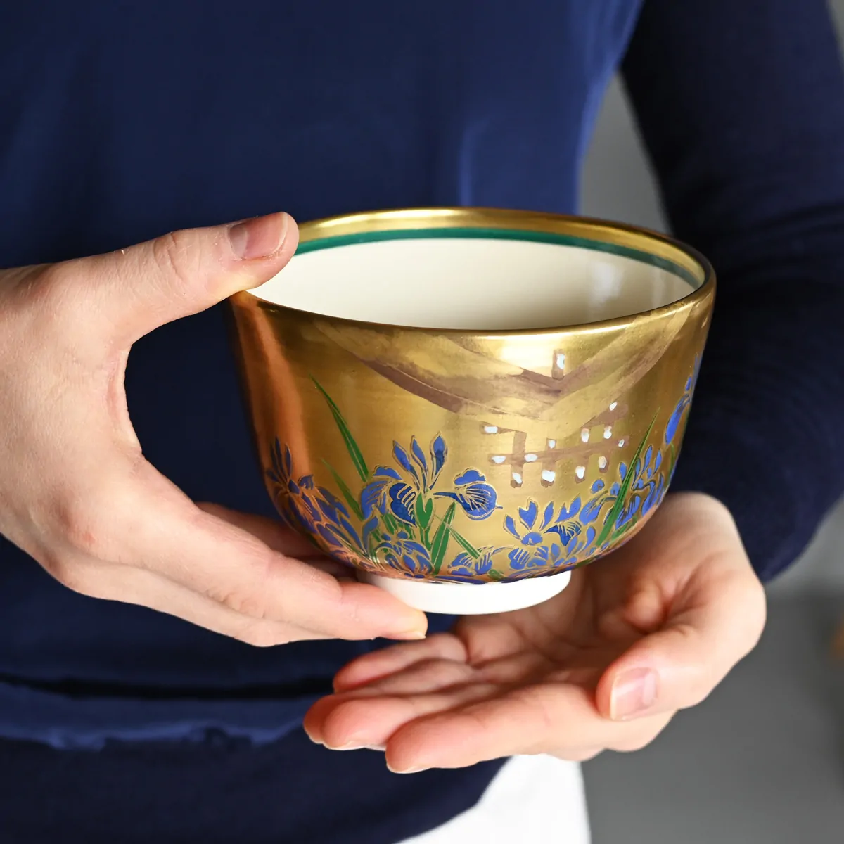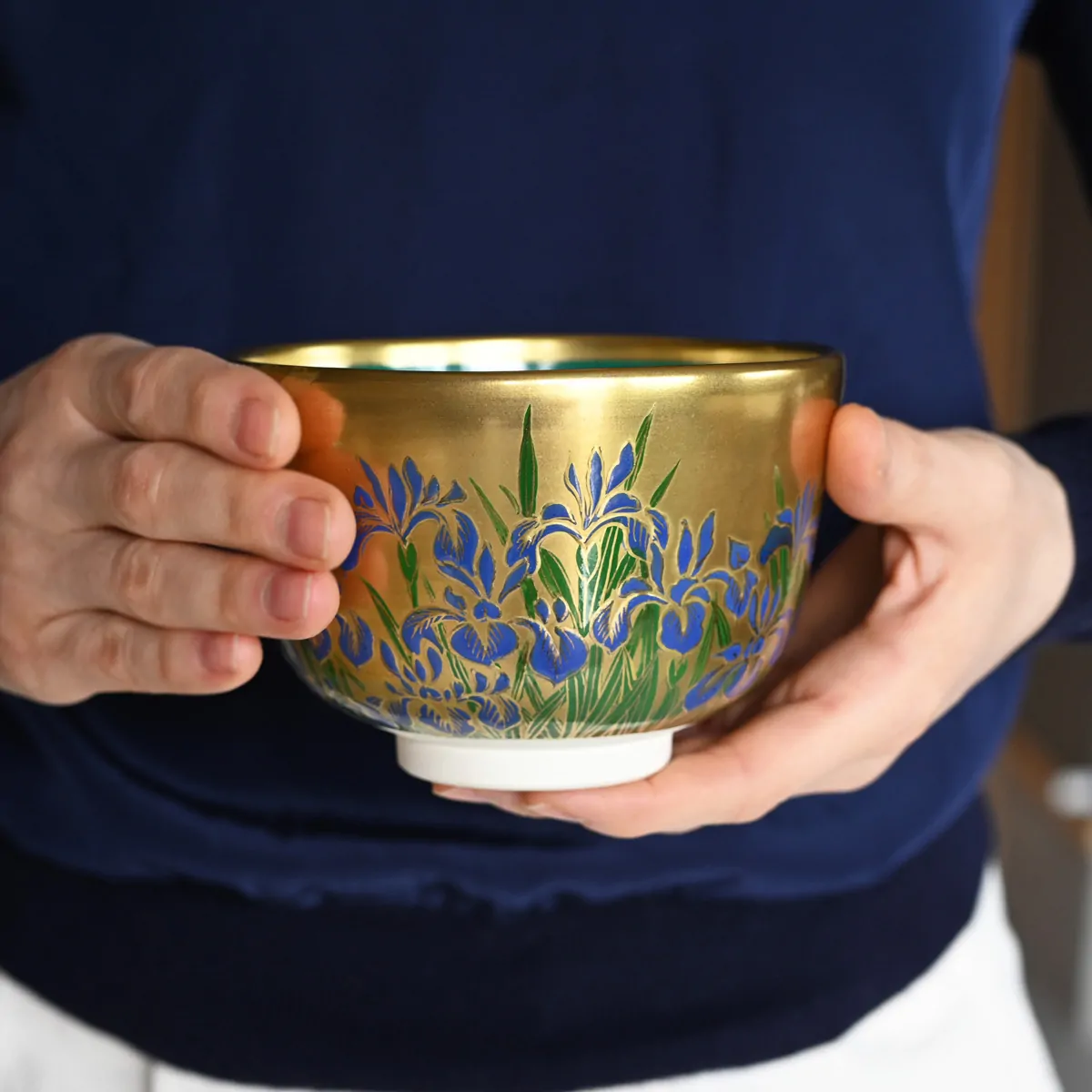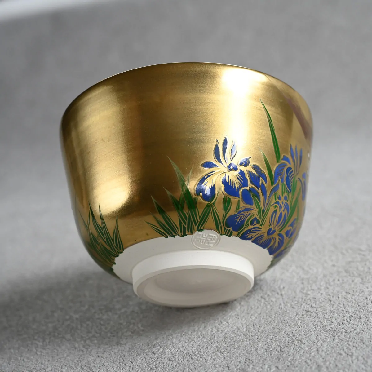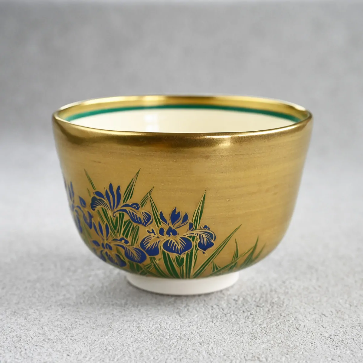 Matcha tea bowl decorated with iris flowers