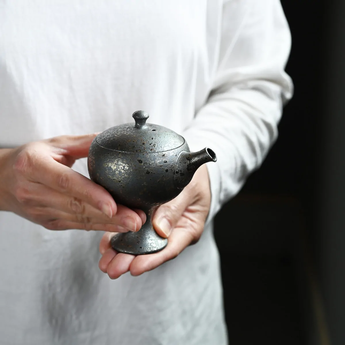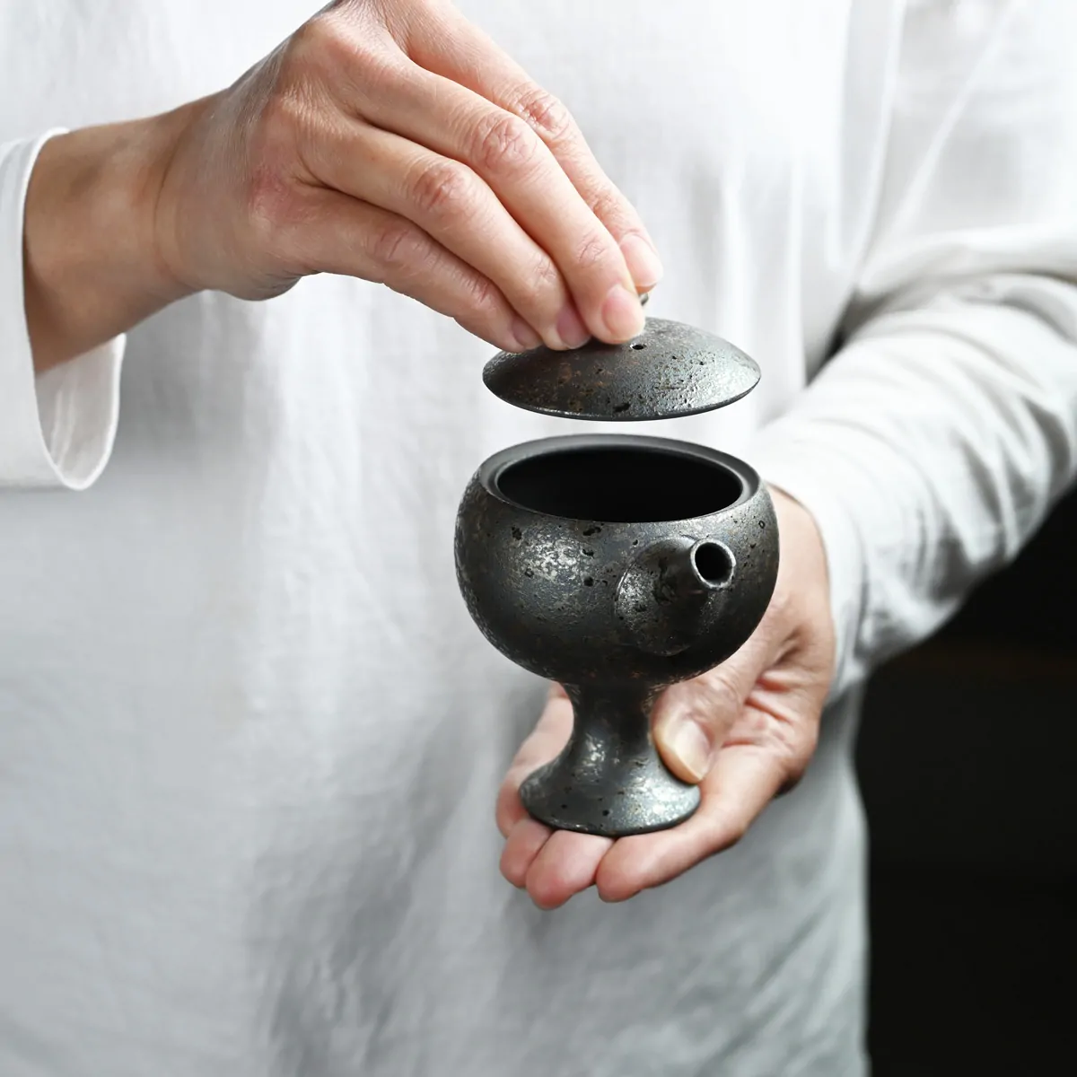 A stylish, very precise teapot, oil-drop glazed on the outside and unglazed on the inside. The pour is beautiful and easy to control.