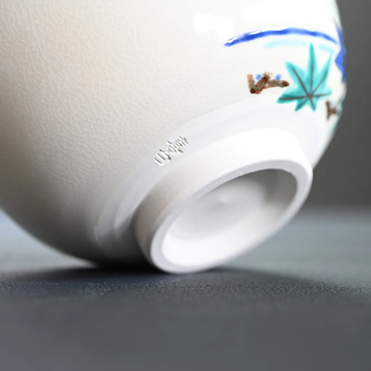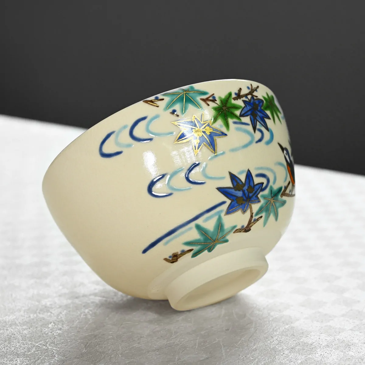 The blue and green maple leaves, water motifs, and kingfisher are cherished symbols of summer in Japan, making this tea bowl a delightful celebration of the season.