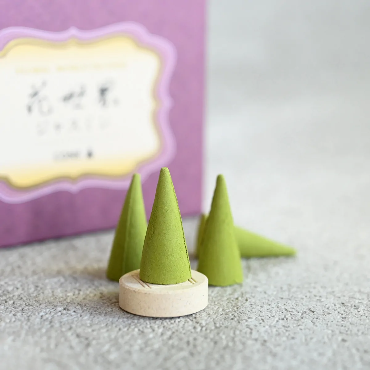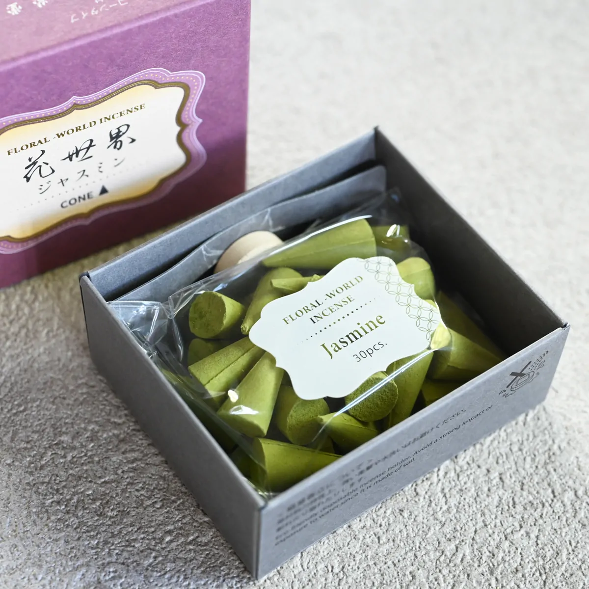 Jasmine-scented cone-type incense for both traditional and modern Japanese incense burners.