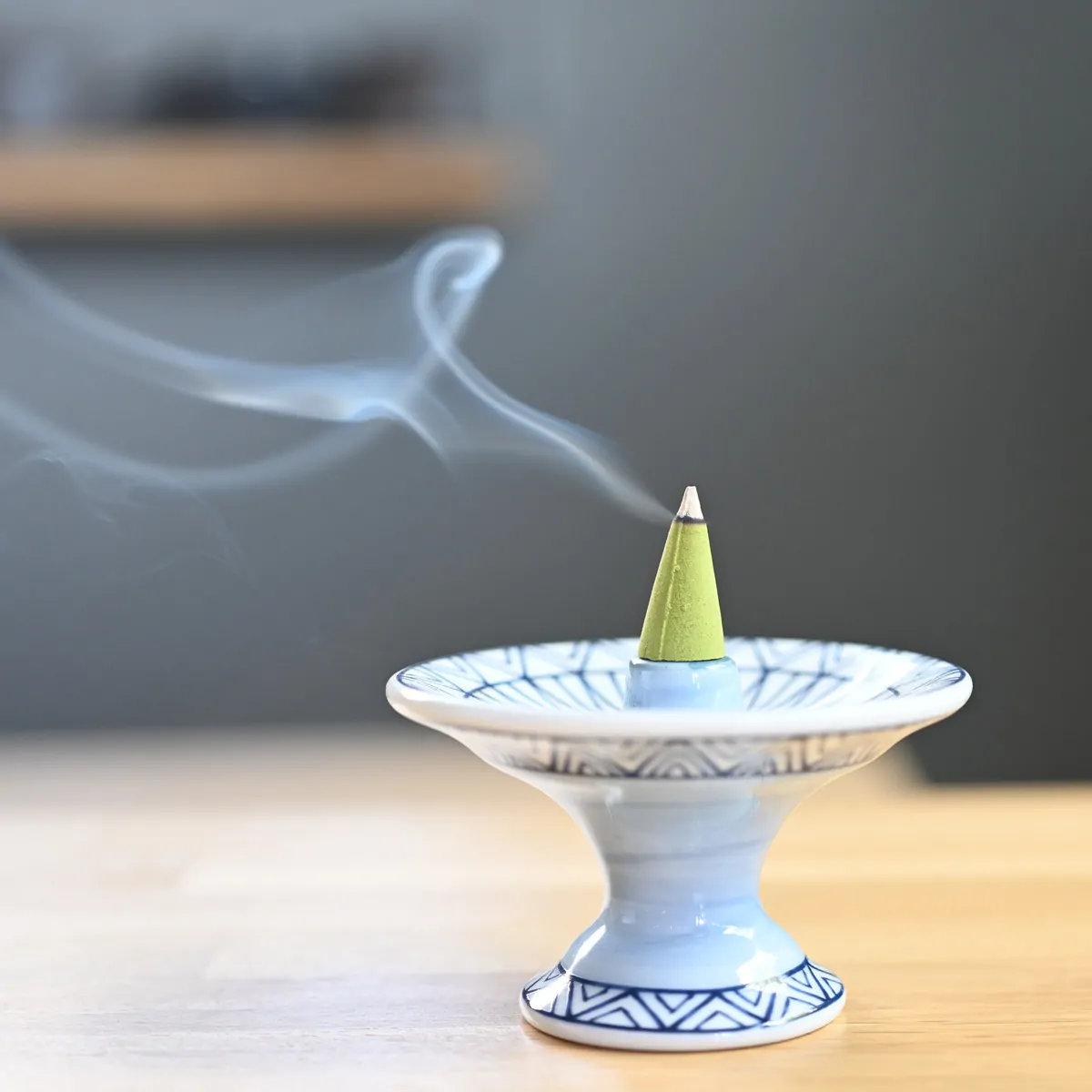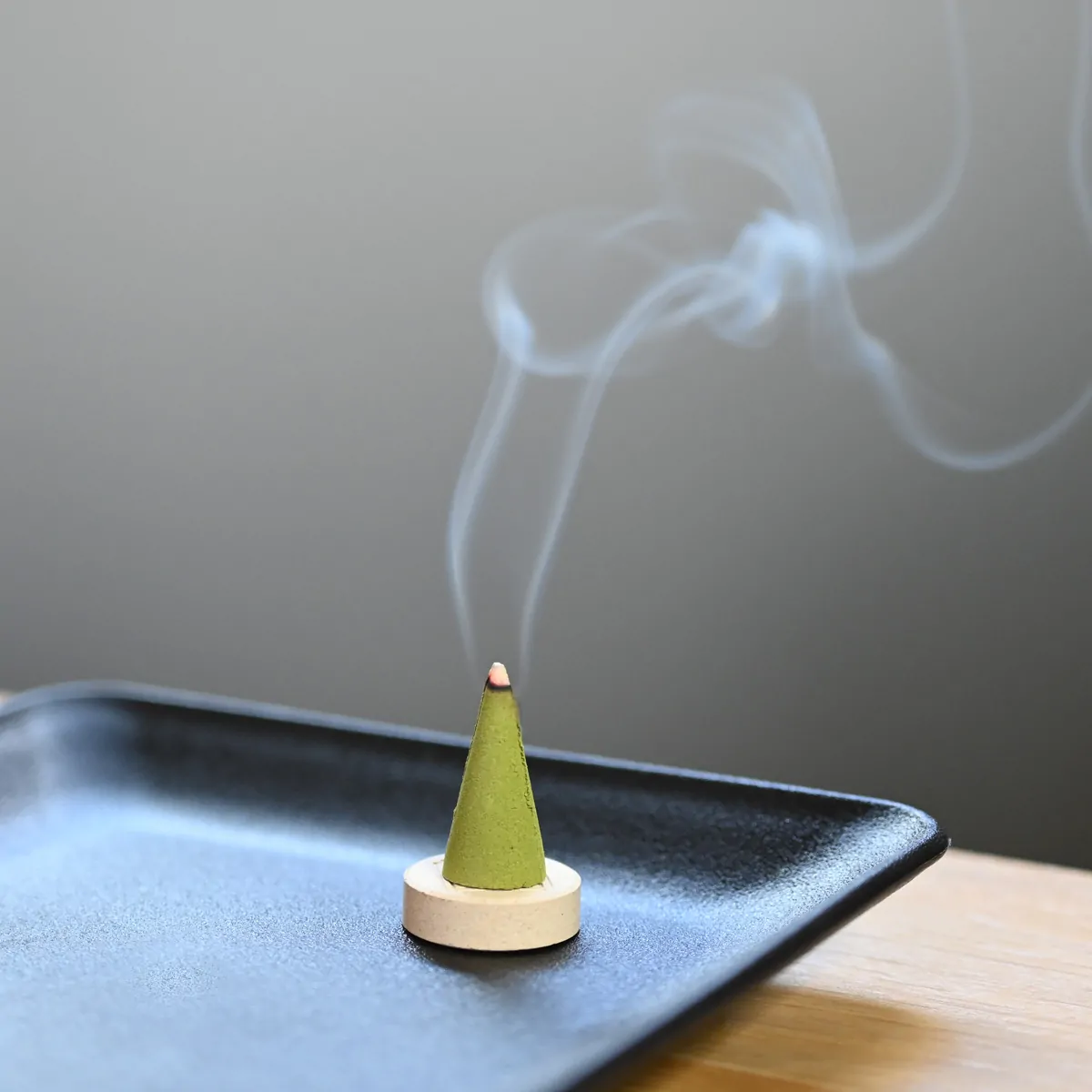 Place the cone on the ceramic cone holder and put them into your incense burner or a fire-proof plate. Light the tip of the cone and let it burn away completely.