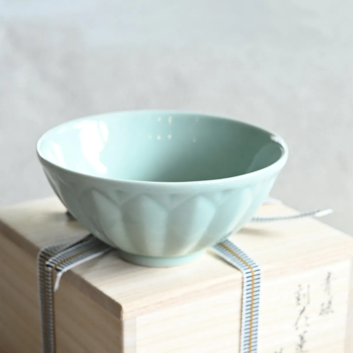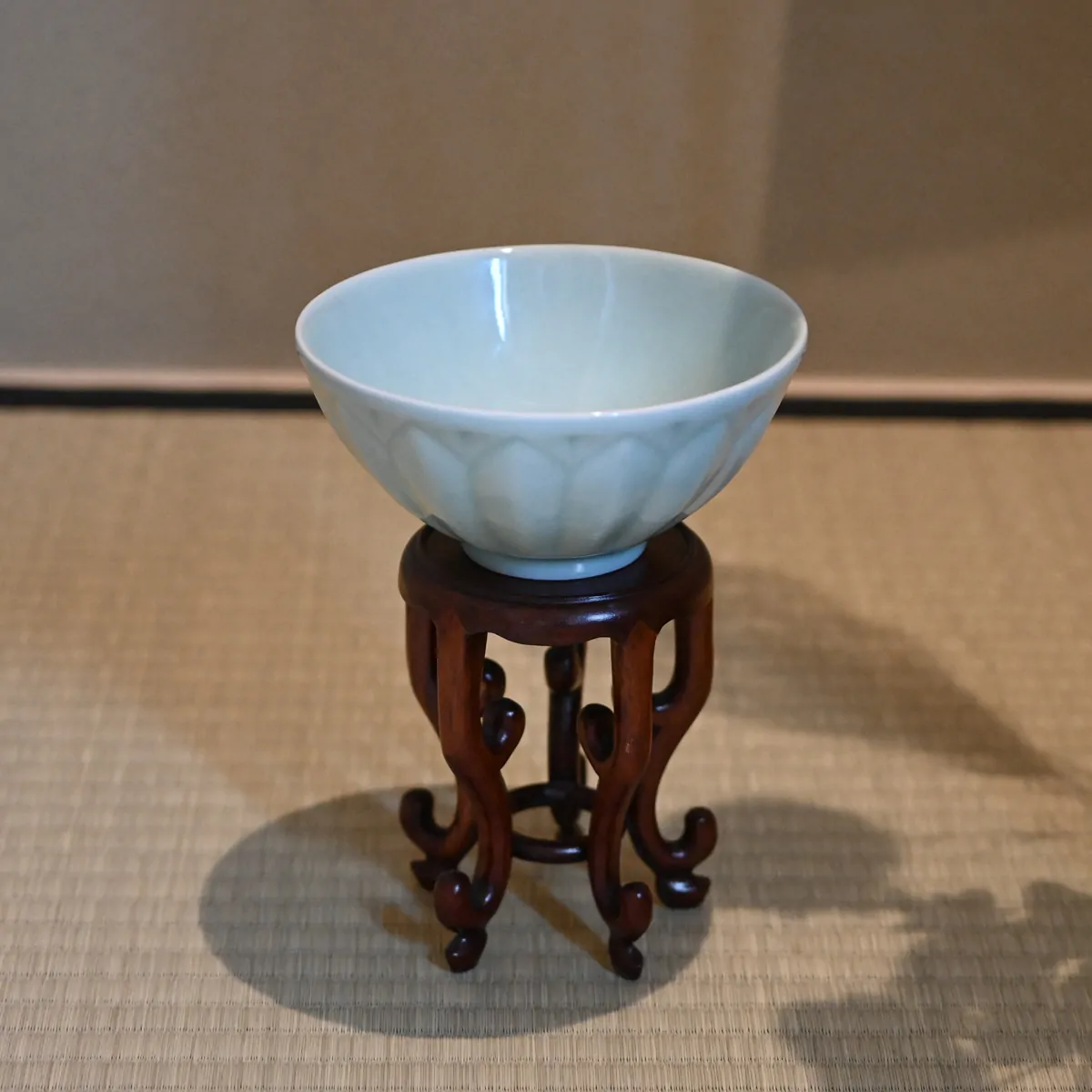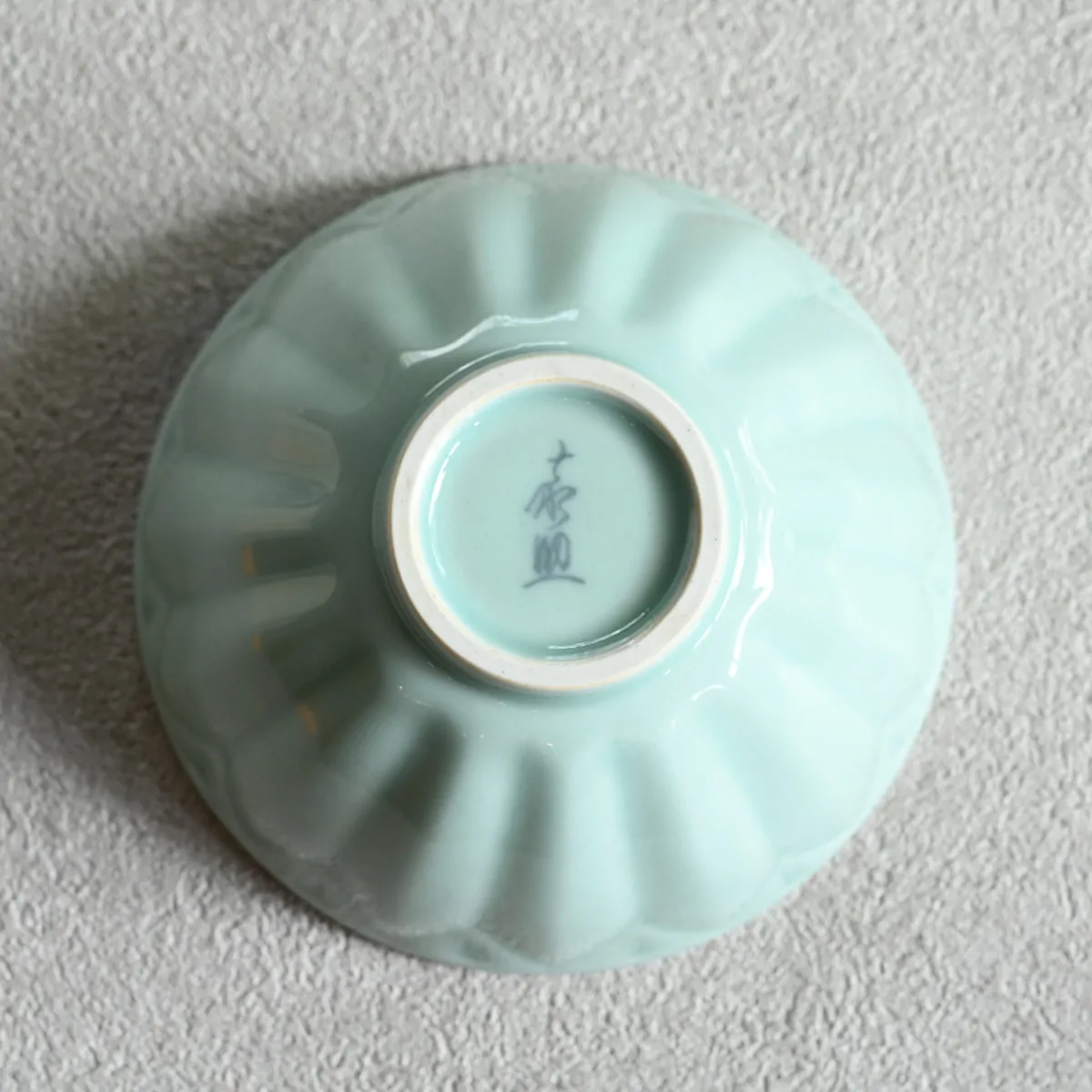 This celadon tea bowl is a replica of a historical tea bowl known as “Renbenmonwan”. Several similar bowls have been unearthed in Japan. The original prototype was crafted in Longquan, China, during the Song Dynasty (13th-14th century), and one of these historical import bowls is now part of the Tokyo National Museum's collection as an important cultural property.