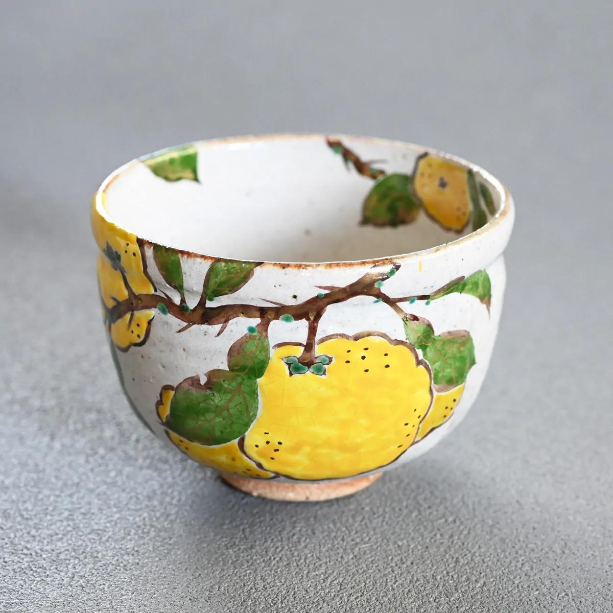 Handmade matcha tea bowl decorated with hand-painted yuzu fruits. The bowl is coated with ash glaze (haiyū).