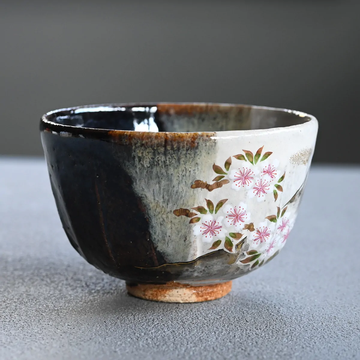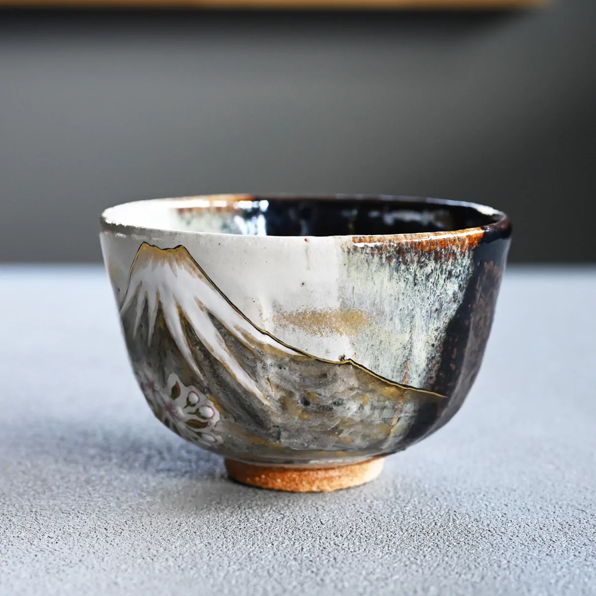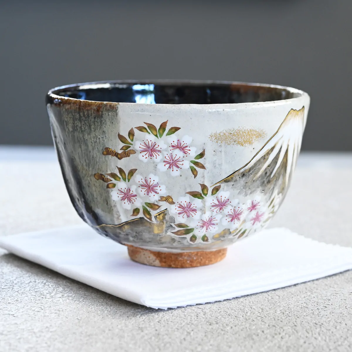 Handmade and hand-painted matcha tea bowl with Mount Fuji and cherry blossom