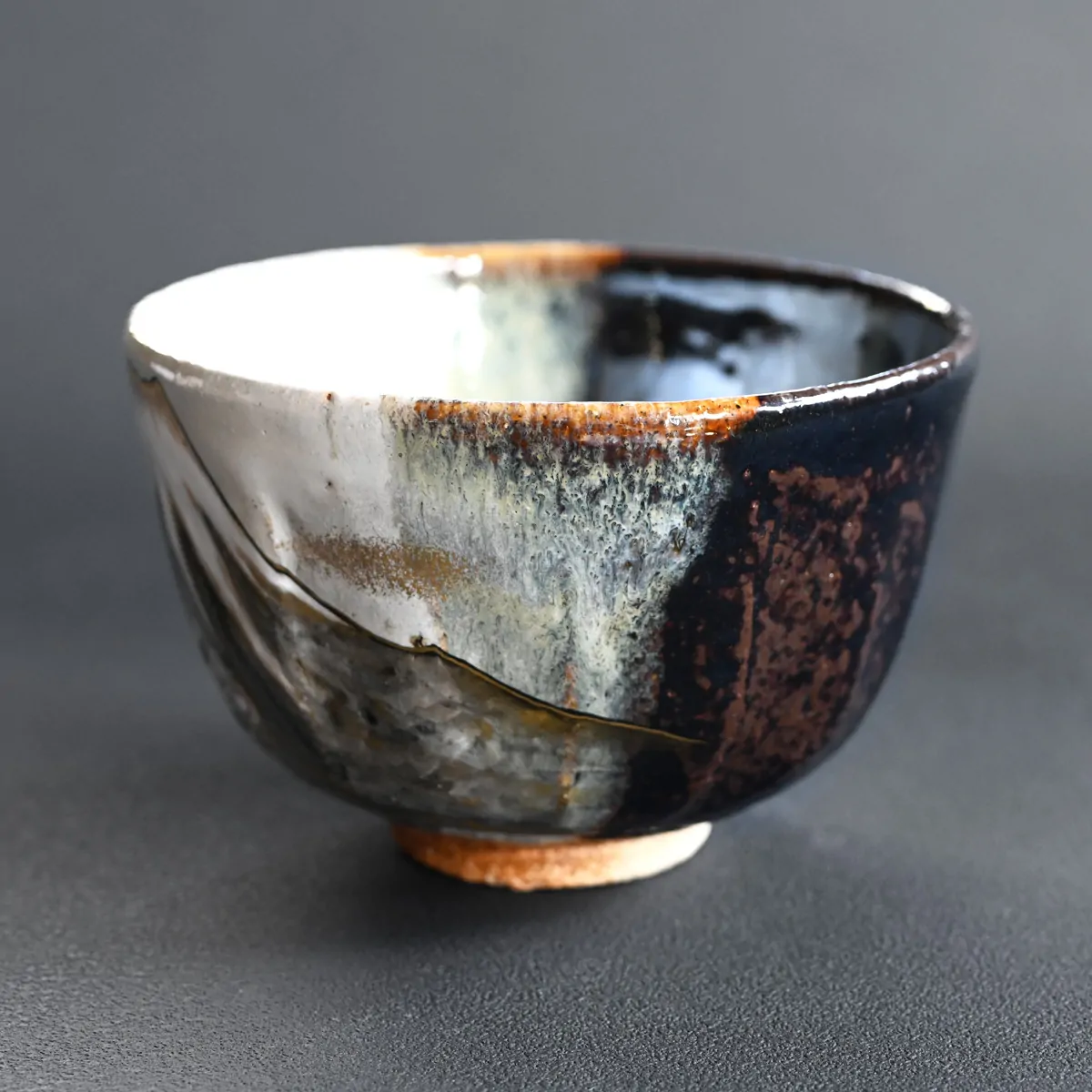 Handmade and hand-painted tea bowl coated with ash glaze. The splitting of glaze colors is a renowned technique called "kakewake", widely used in Japanese pottery.