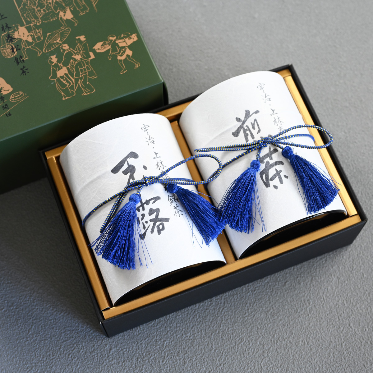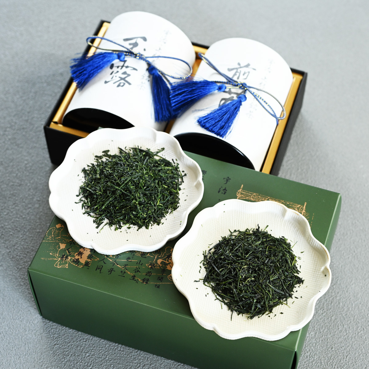 An elegant and exquisite gift set including Gyokuro Gyokuheki and Sencha Kisen in stylish tea caddies.