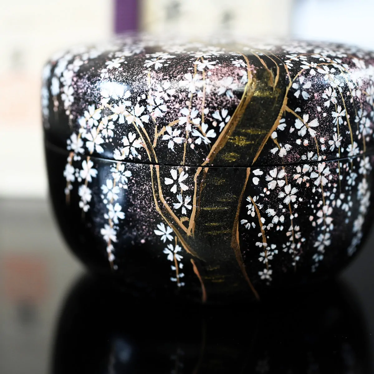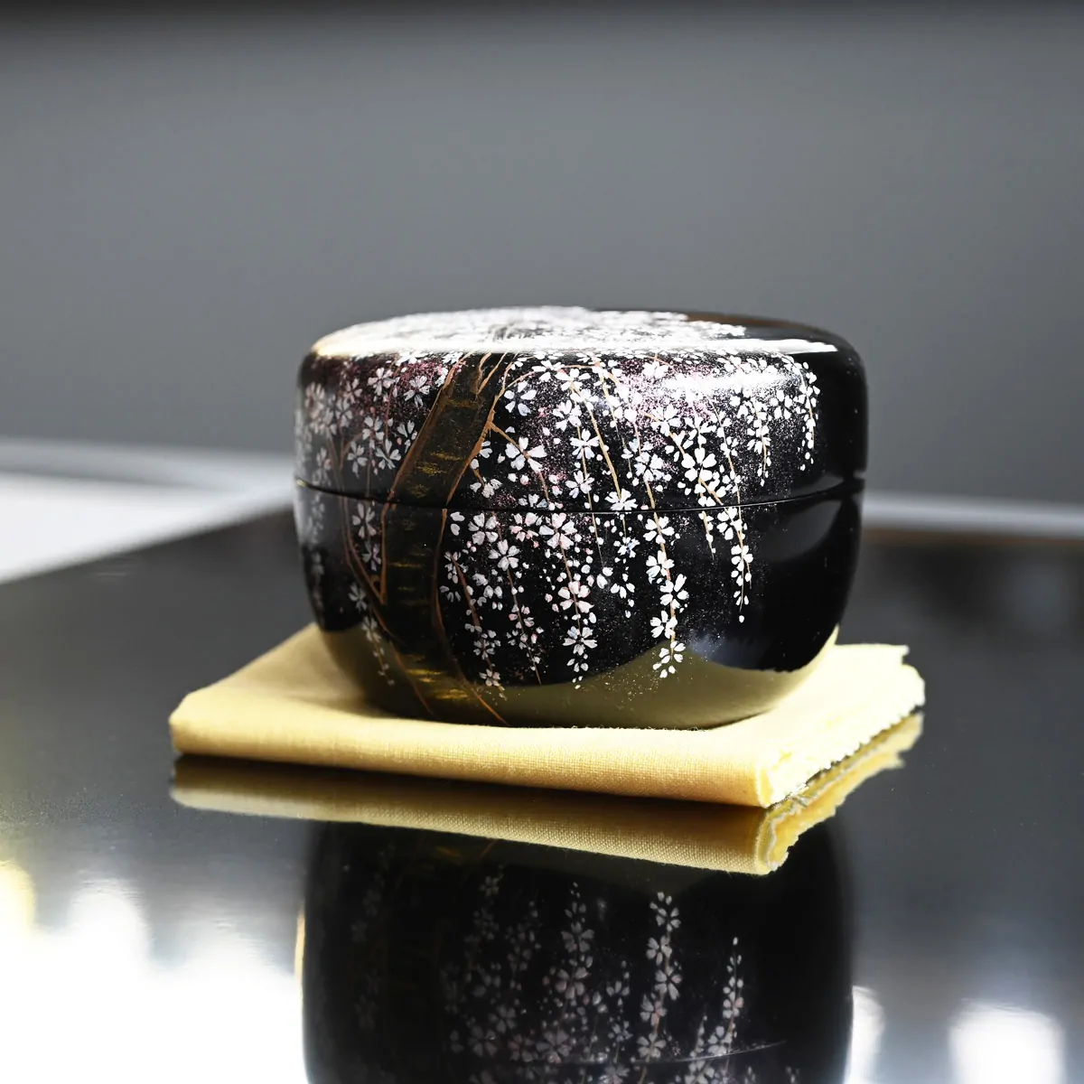 A shidarezakura tree is painted on the lacquer with stunning detail. Shidarezakura refers to a type of cherry blossom tree, specifically a variety of weeping cherry. This tree is known for its graceful, cascading branches that droop downward, creating a beautiful, flowing display of blossoms.