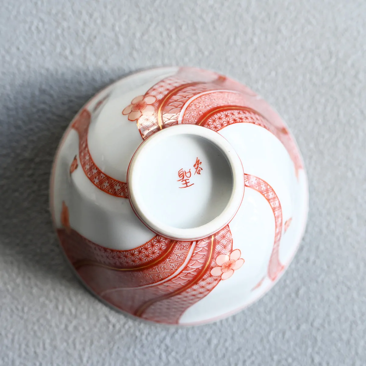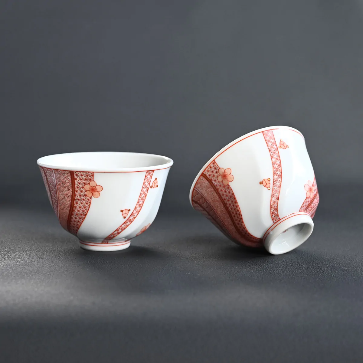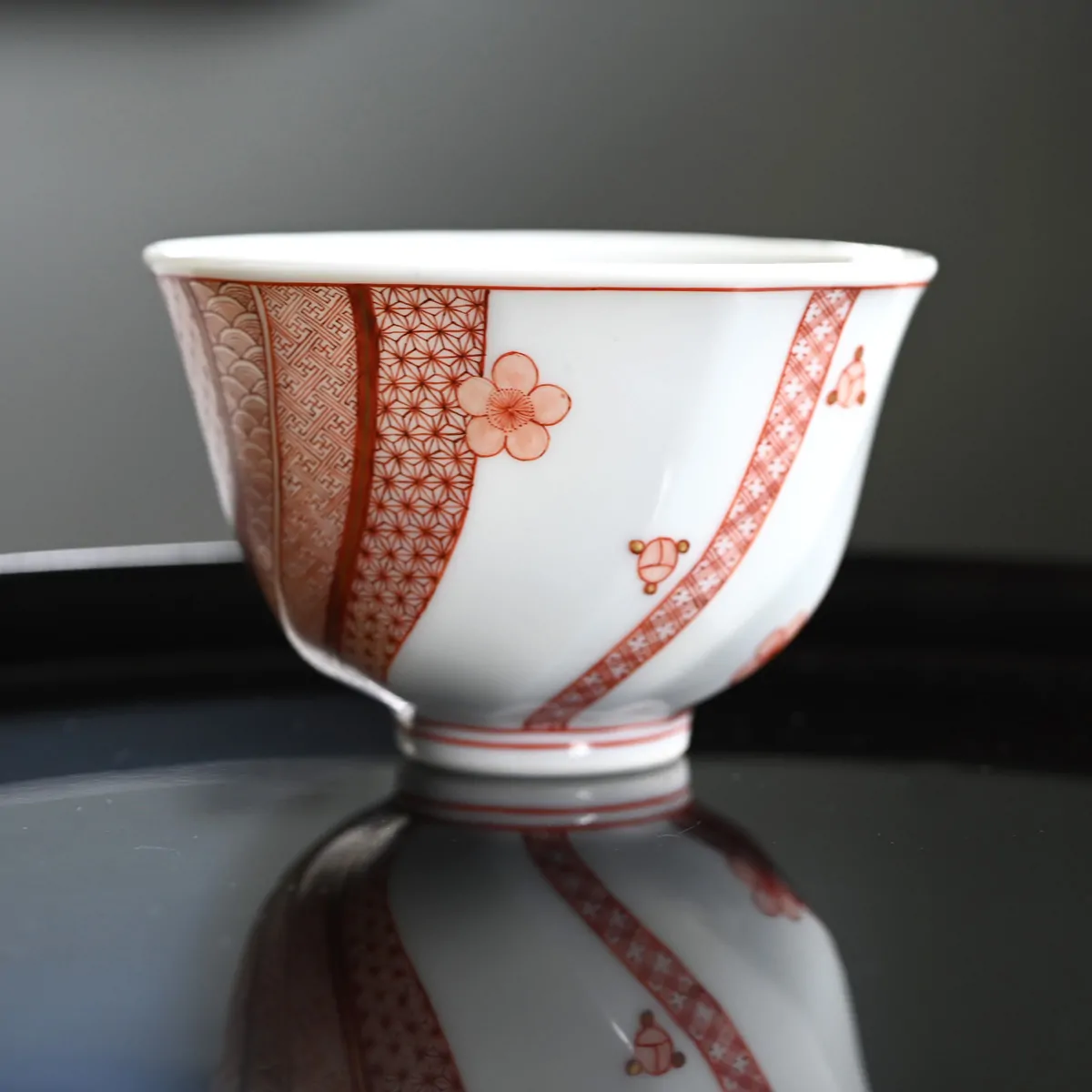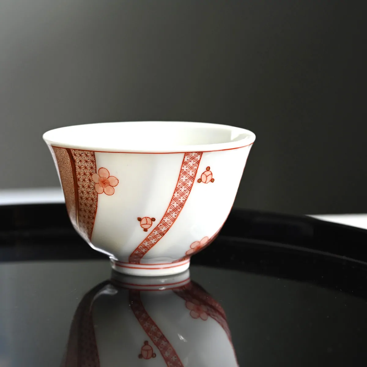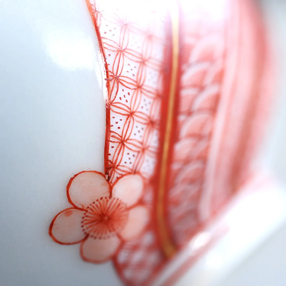 The traditional Japanese geometric patterns and plum blossom are hand-painted with stunning detail using the so-called Aka-e technique. Aka-e is one of the three major techniques used in Kutani ware. The artist creates patterns with extremely fine lines, as thin as a hair, using a red pigment known as bengara, which contains iron.