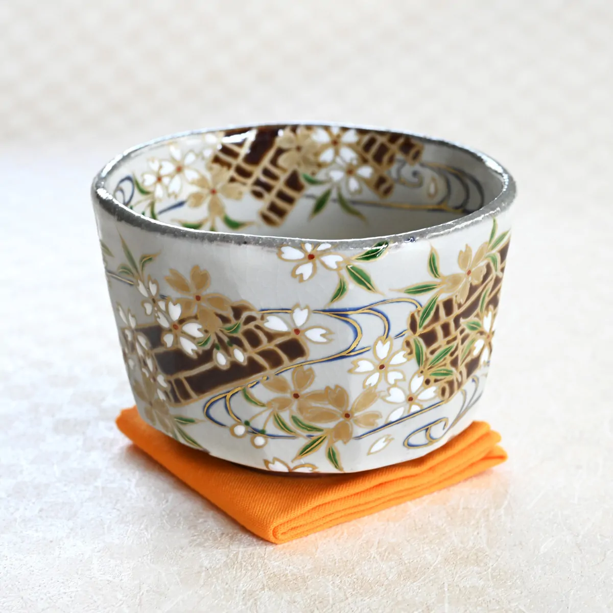 Matcha tea bowl decorated with hand-painted cherry blossom and a floating raft from Katō Josui