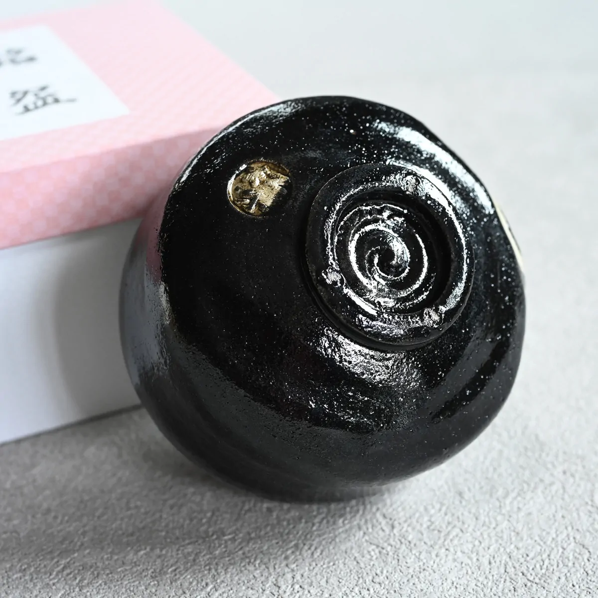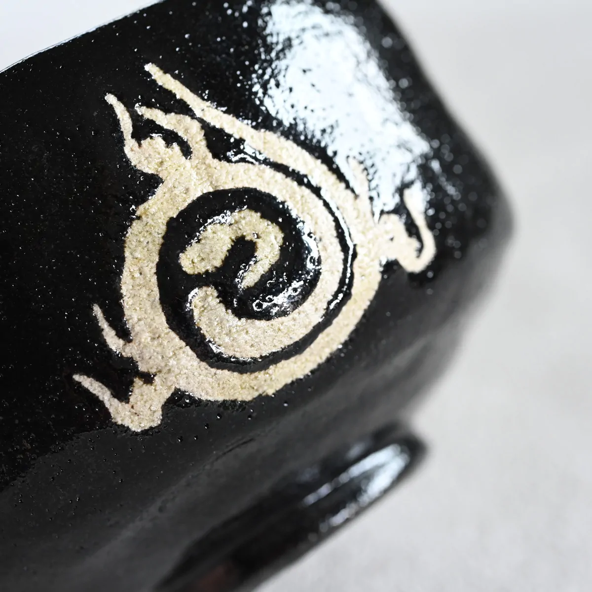 In Japanese culture, the "hōju" (宝珠), or wish-fulfilling jewel, is a sacred, spherical object, often found in Buddhist contexts, symbolizing blessings, the granting of wishes, and the expulsion of evil. On this chawan the white snake is pictured as a wish-fulfilling jewel.