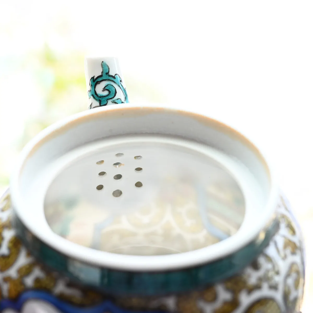 The teapot is painted in stunning detail. The porcelain is so fine that it is translucent, the outer paint shining through when held up to the light.
