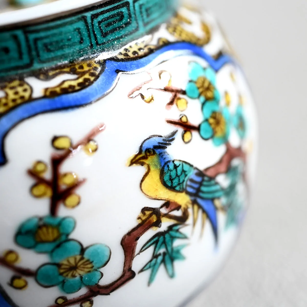 This particular teapot was painted in Ko-Kutani style. The term "Kutani" means "Nine Valleys" and was first mentioned in 1655. Clays for porcelain were discovered in the Kutani mines and the earliest pottery made from the local clay is known as old Kutani (Ko-Kutani). Ko-Kutani, popular for decades but now very rare, featured Aote (green, yellow, blue, purple) and Iroe (red, green, purple, blue, yellow) styles.