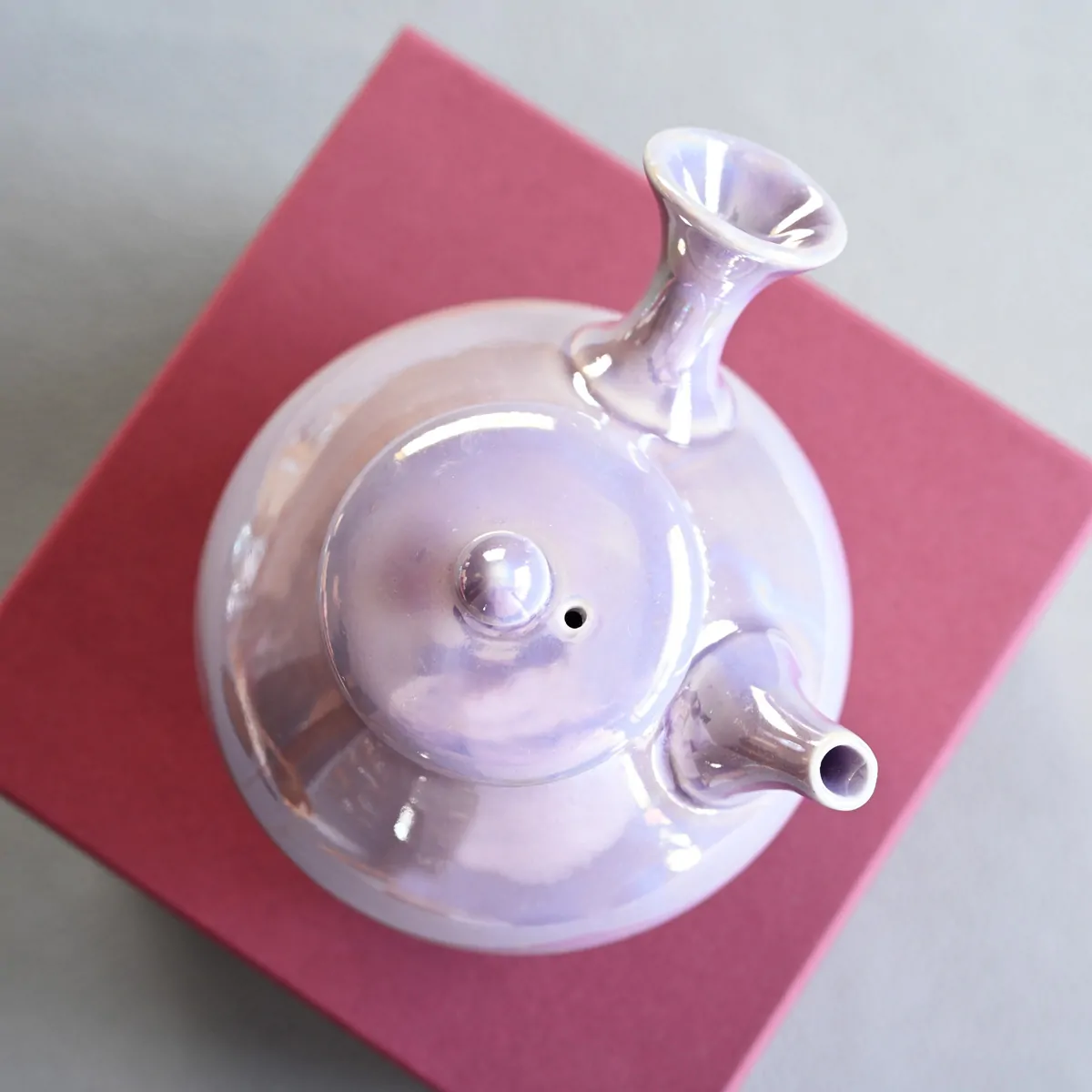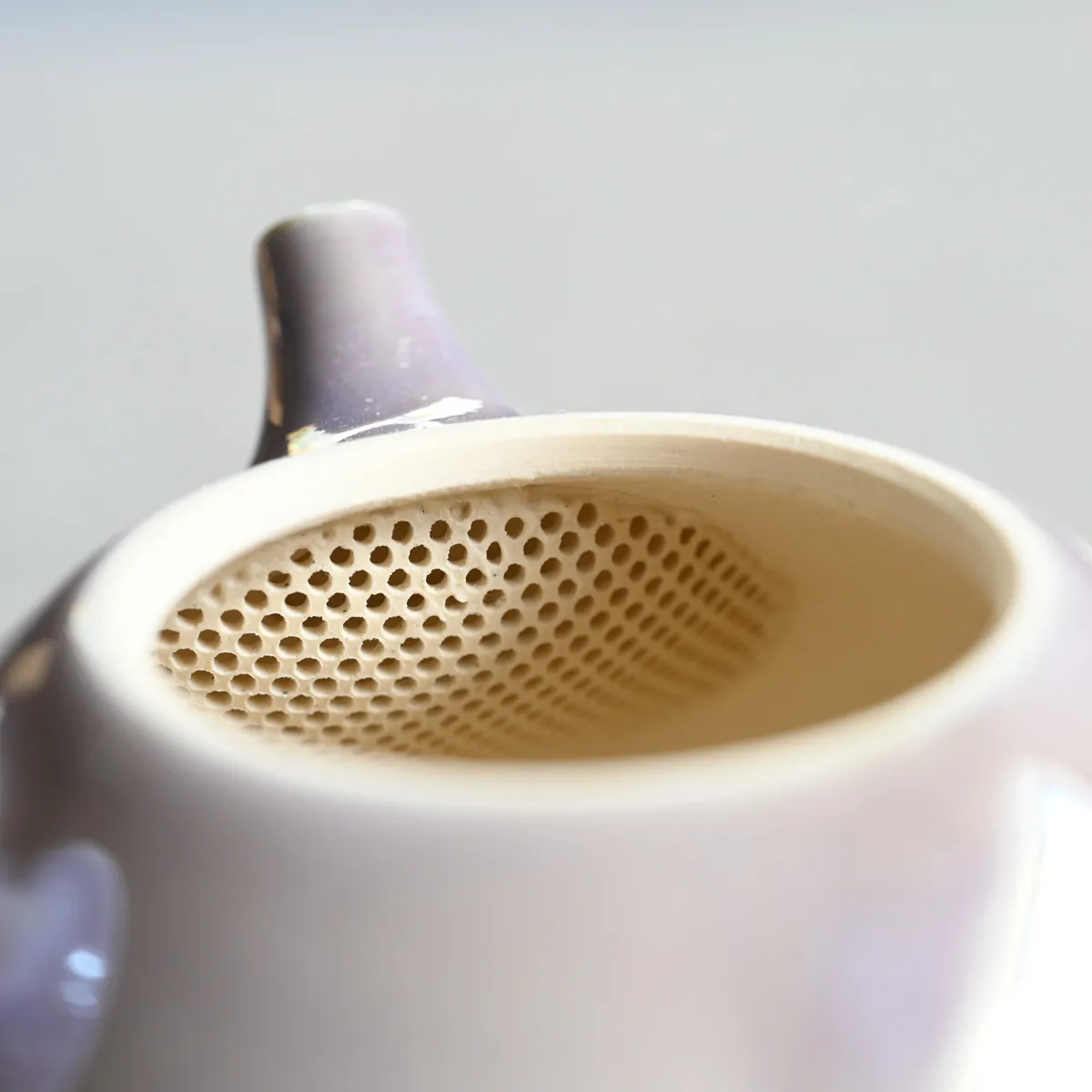 The teapot is made of white clay and as a beautiful final touch, it is coated with an amethyst color luster glaze on the outside. Inside it stays unglazed.
