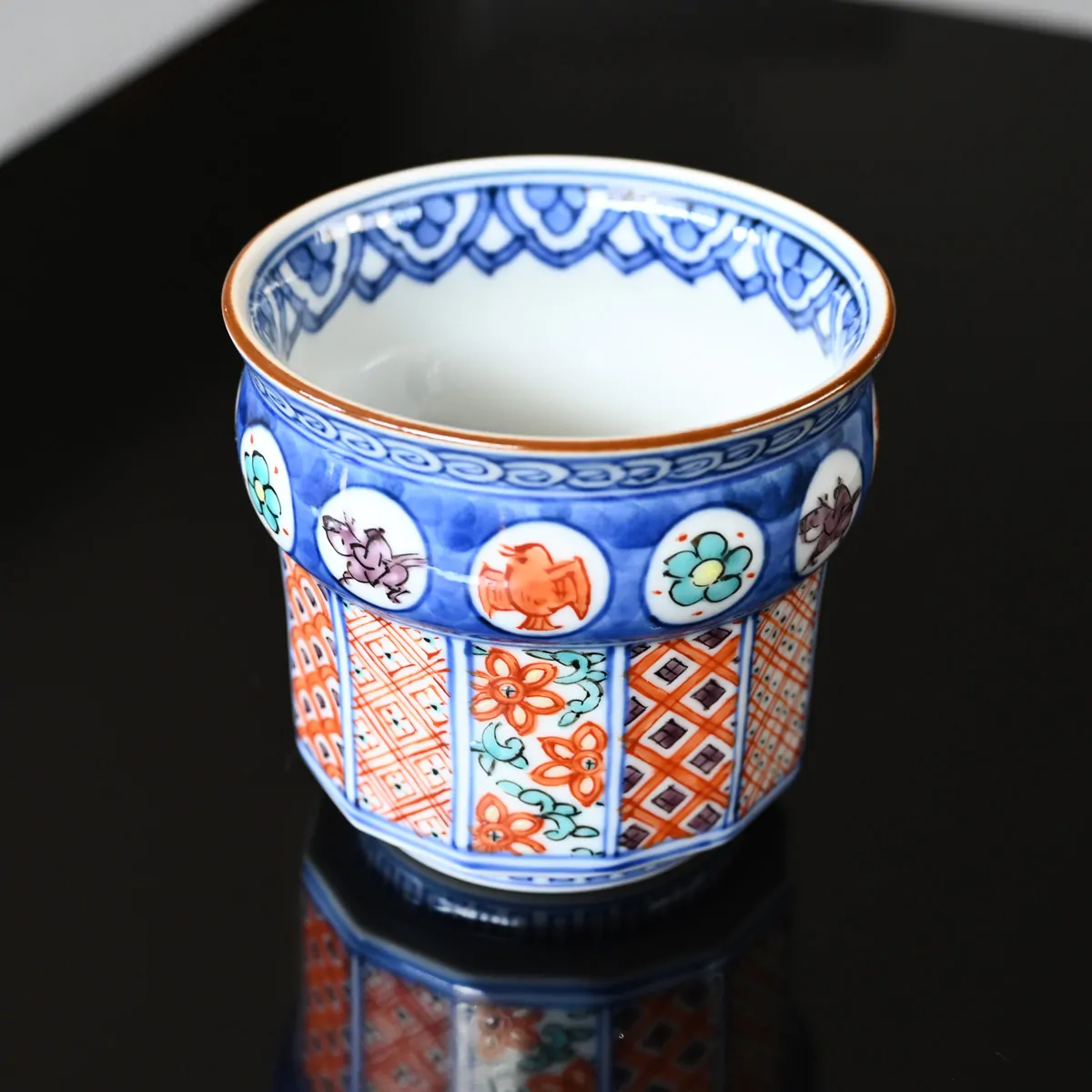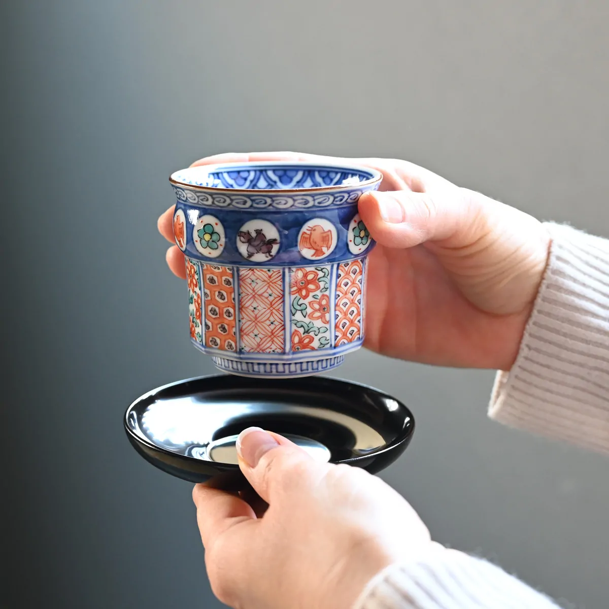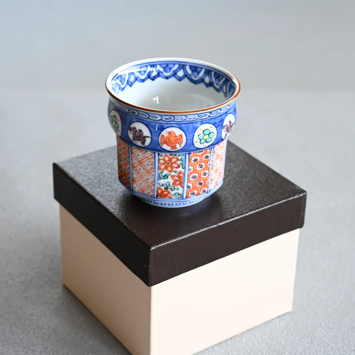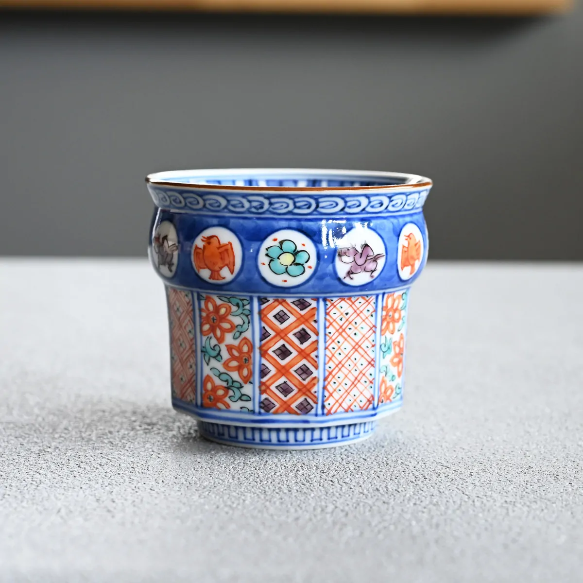 This handmade porcelain cup is beautifully hand-painted with intricate details, including geometric patterns, flowers, birds, and decorative elements inspired by traditional Chinese and Japanese art.