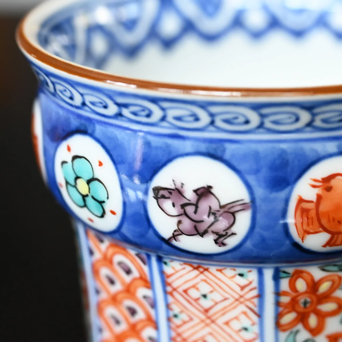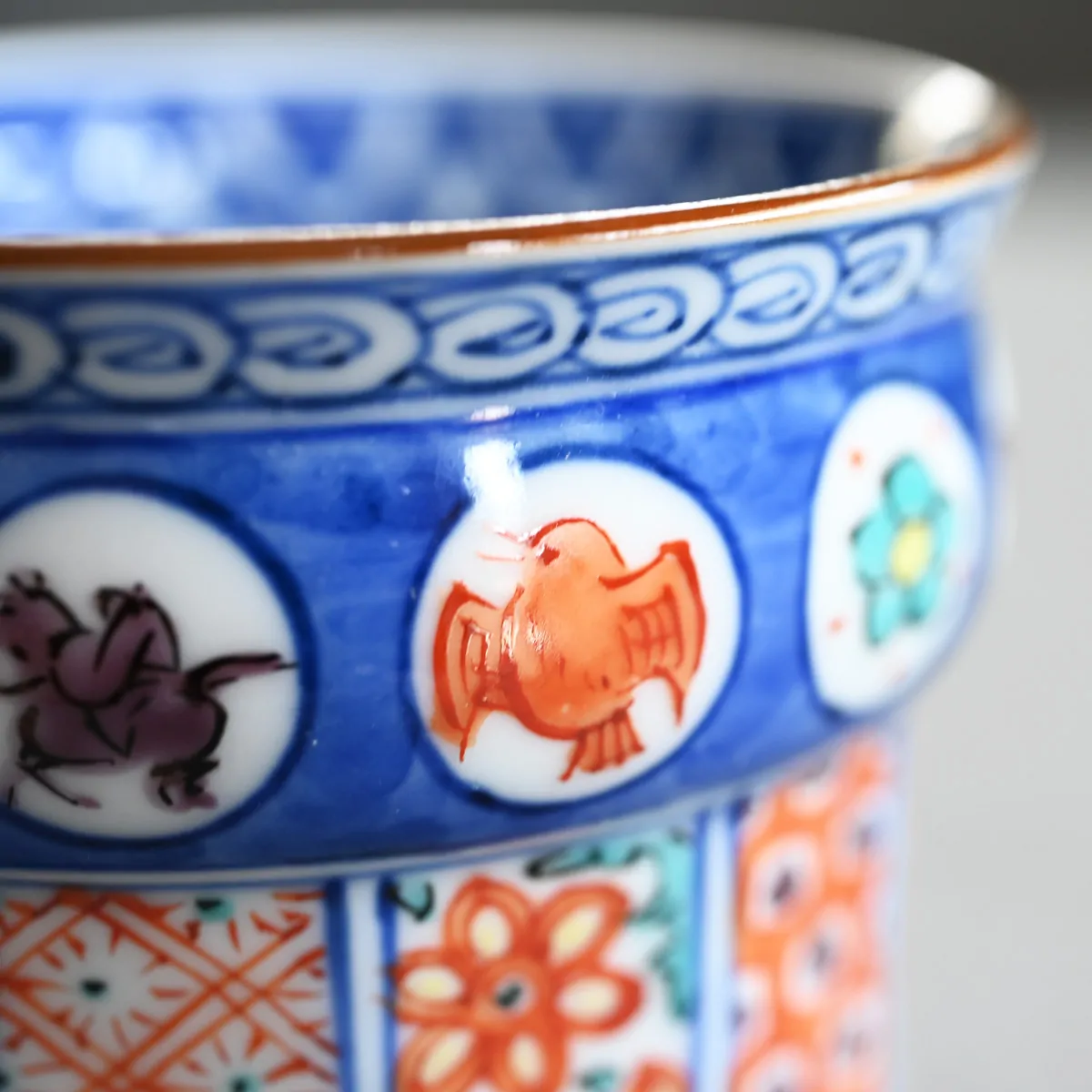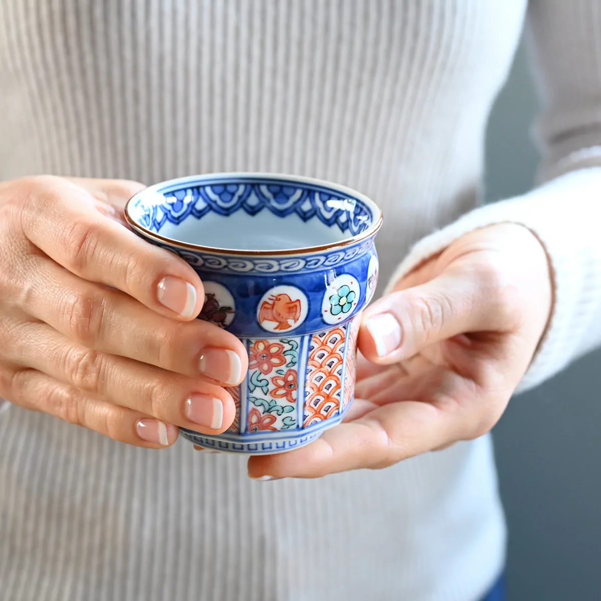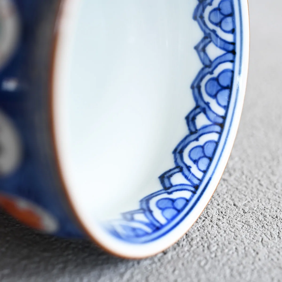This handmade porcelain cup is beautifully hand-painted with intricate details, including geometric patterns, flowers, birds, and decorative elements inspired by traditional Chinese and Japanese art.