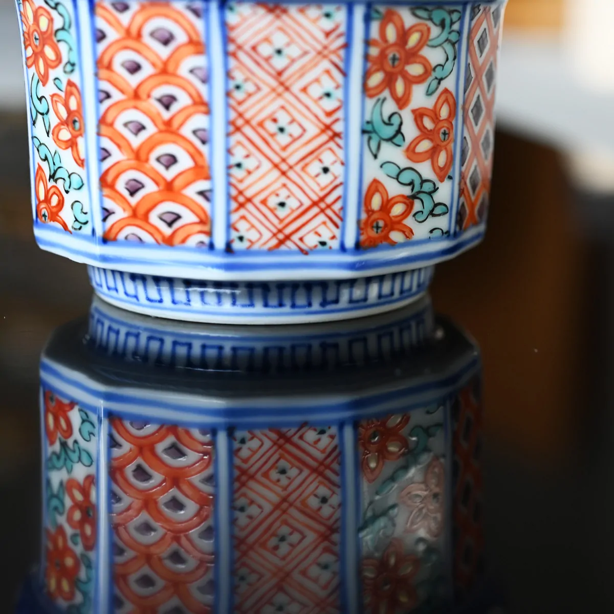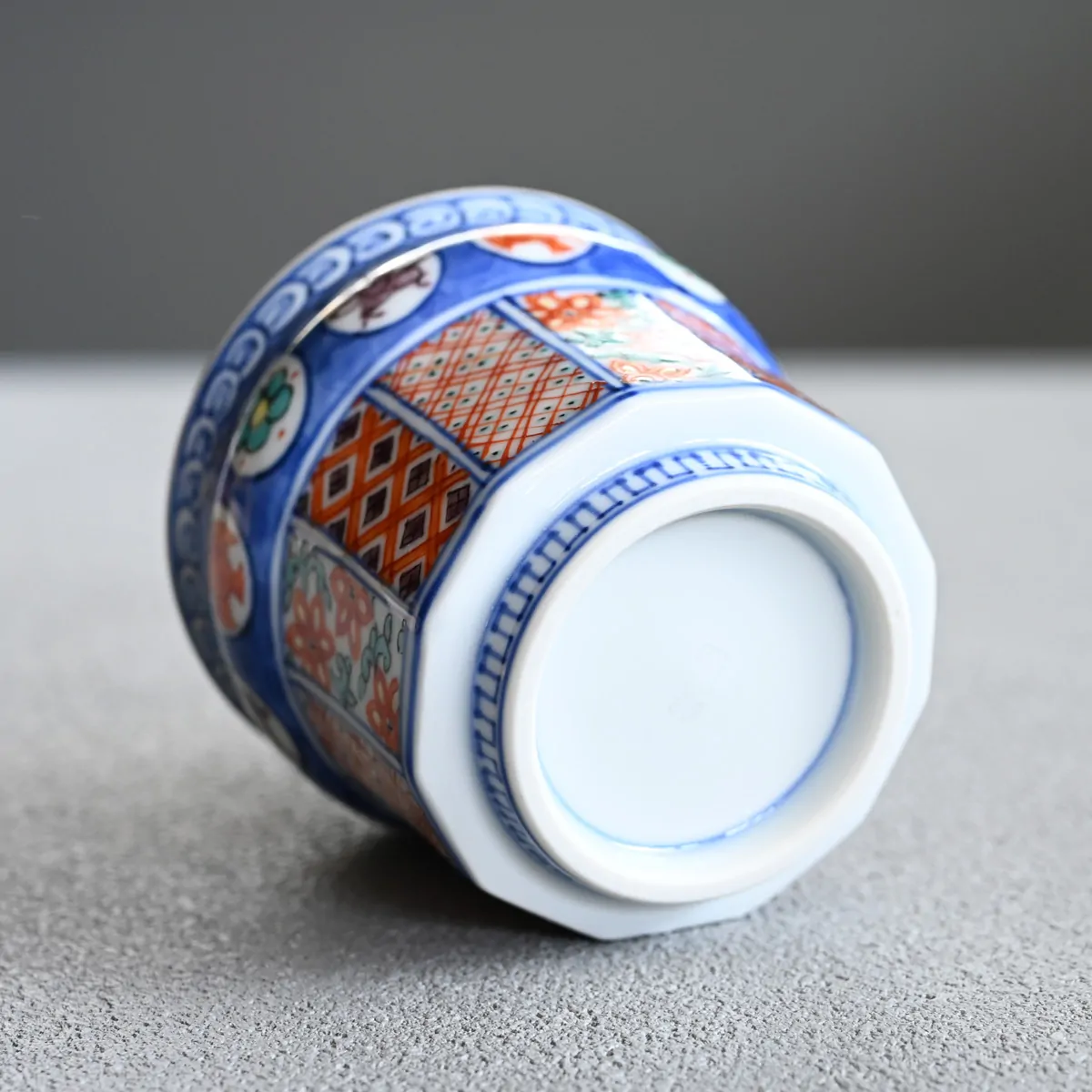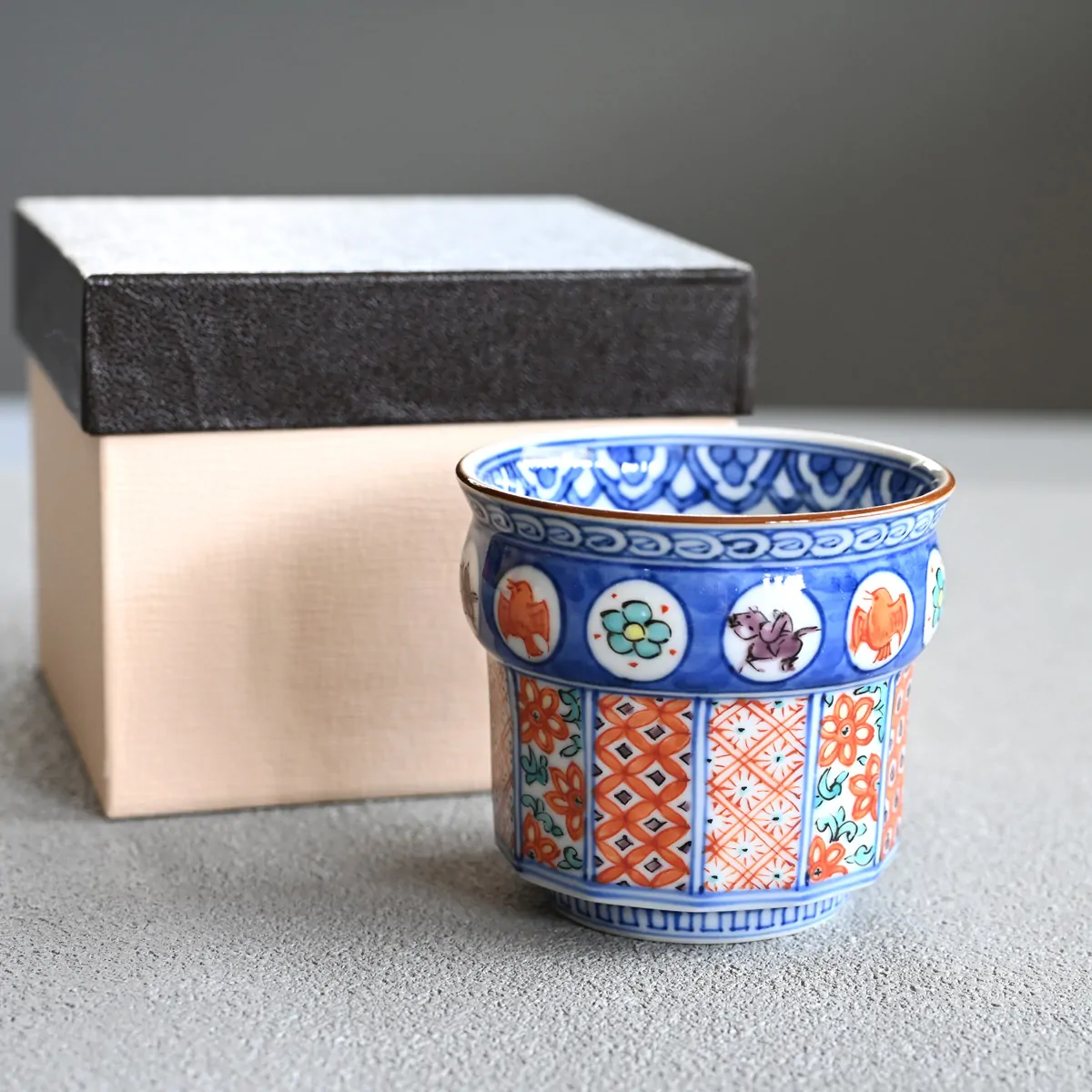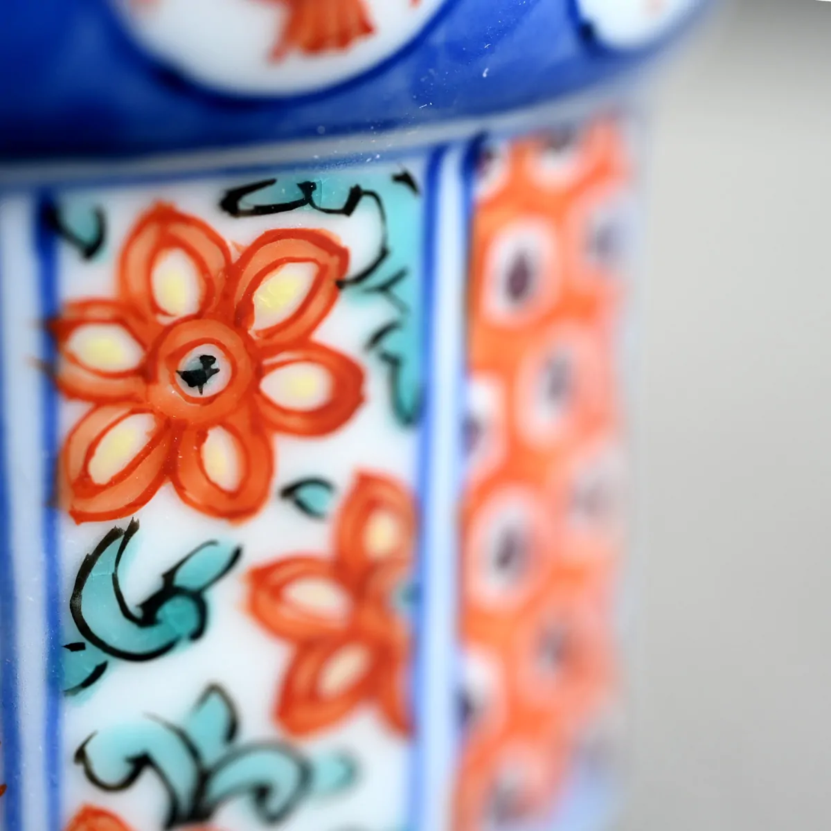This handmade porcelain cup is beautifully hand-painted with intricate details, including geometric patterns, flowers, birds, and decorative elements inspired by traditional Chinese and Japanese art.