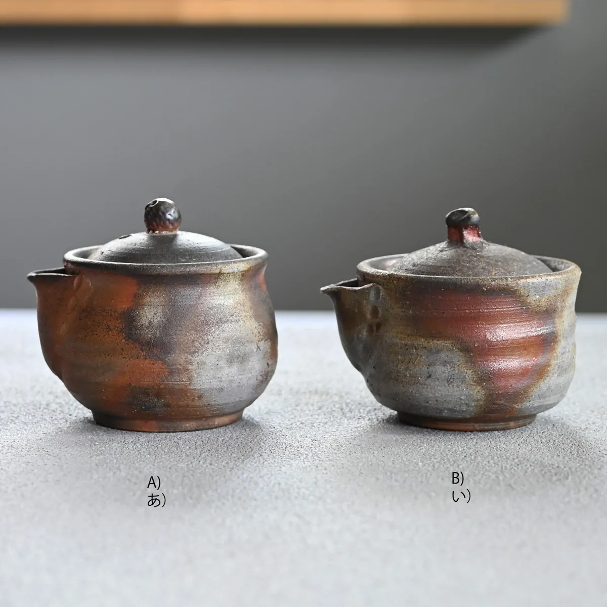 We have only two pieces of this teapot, each with a unique design and finish, so we've labeled them A) and B).