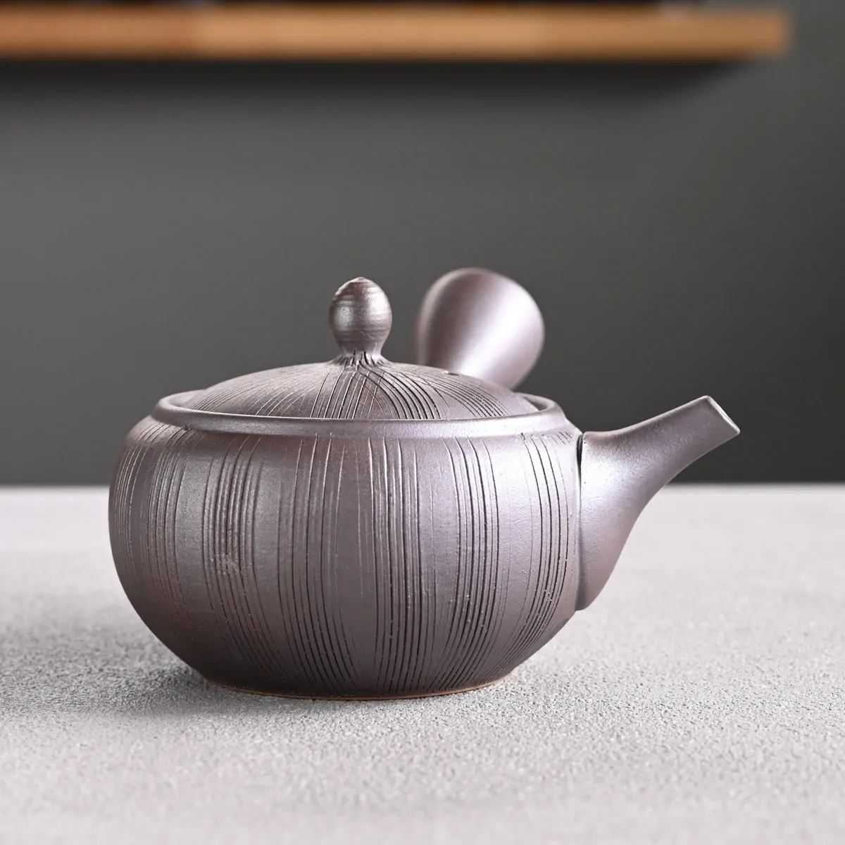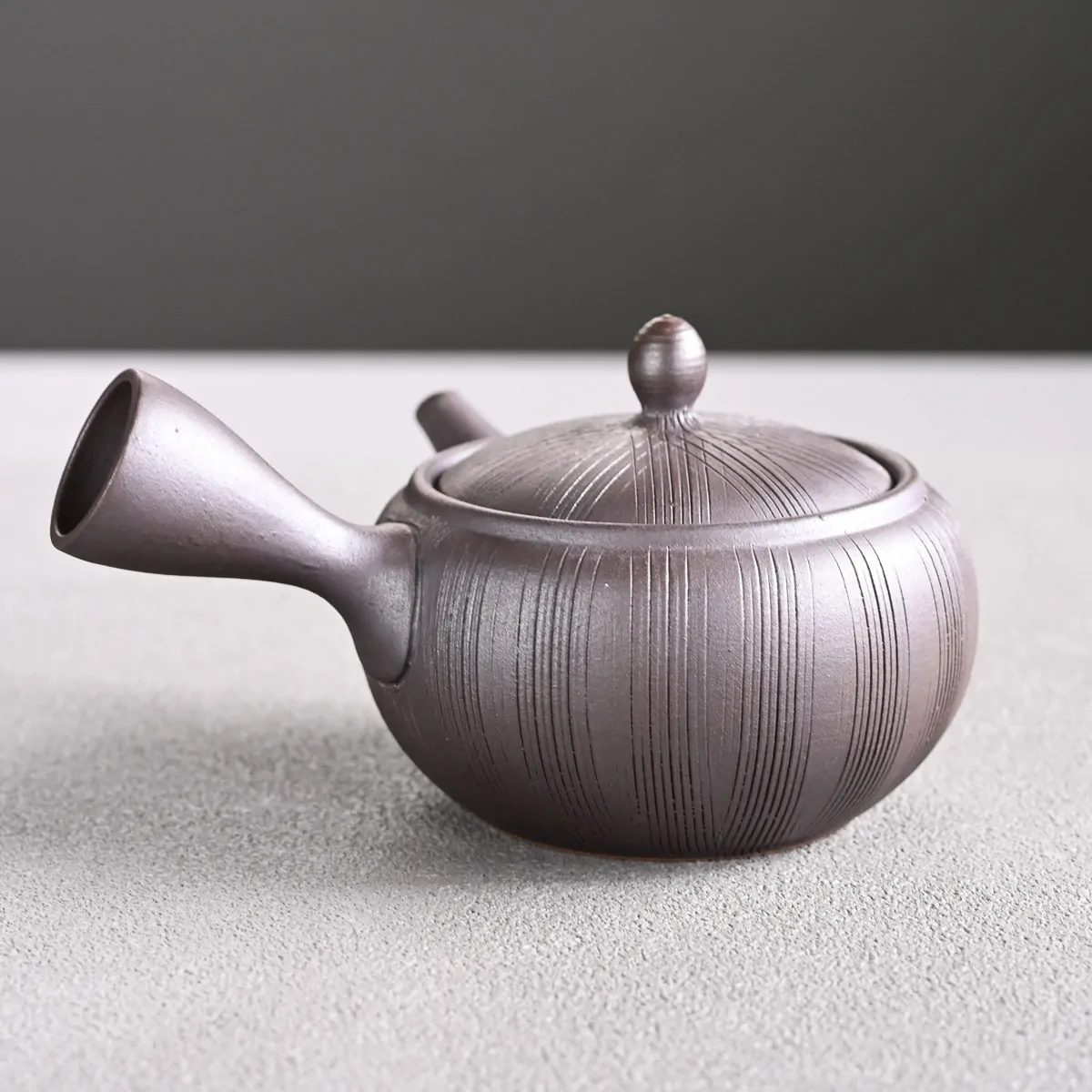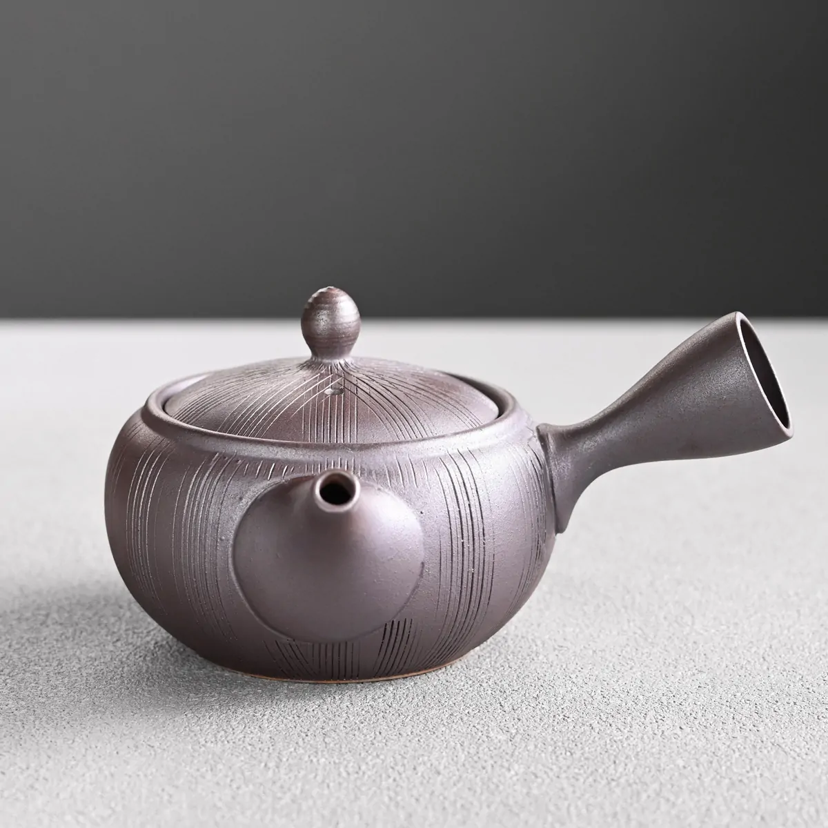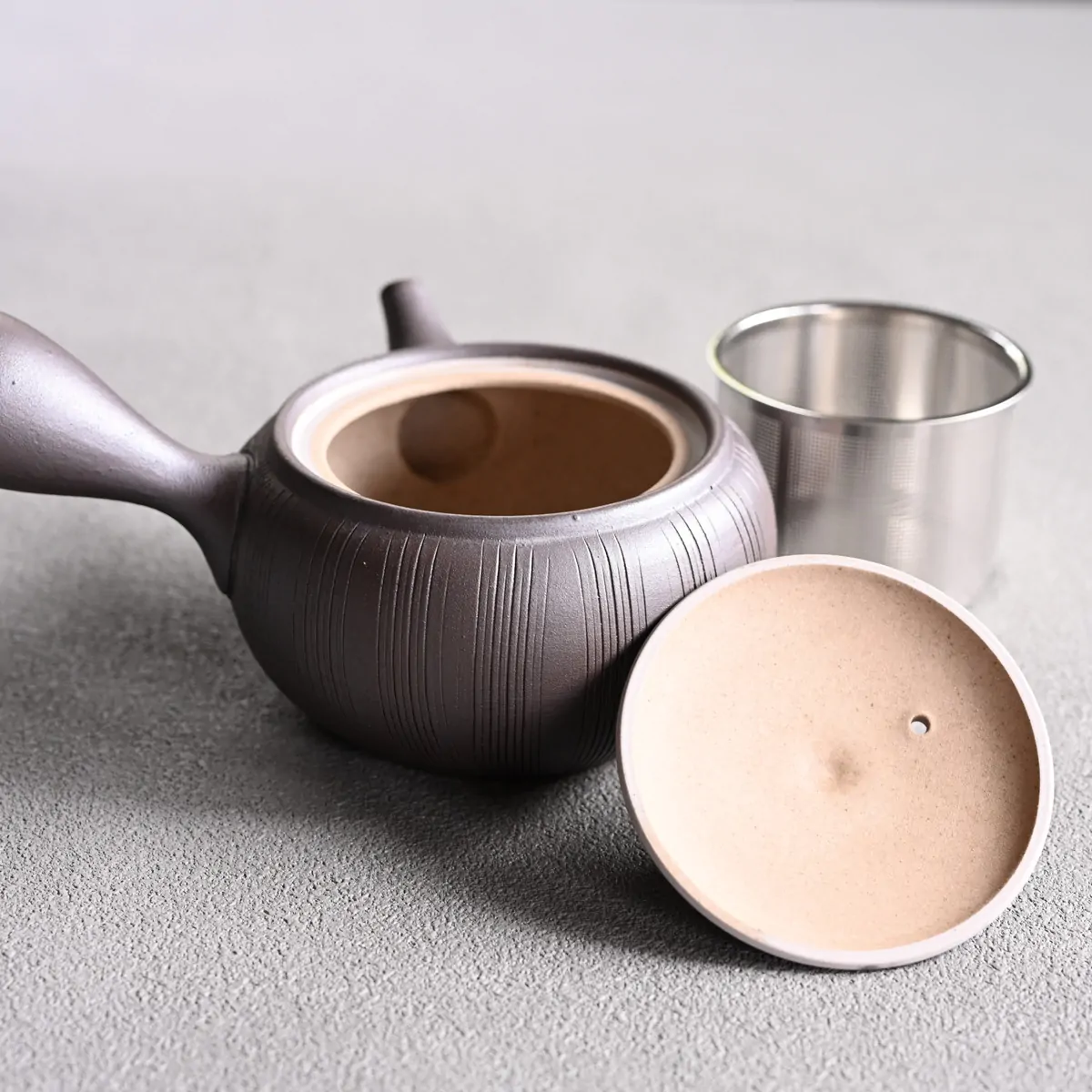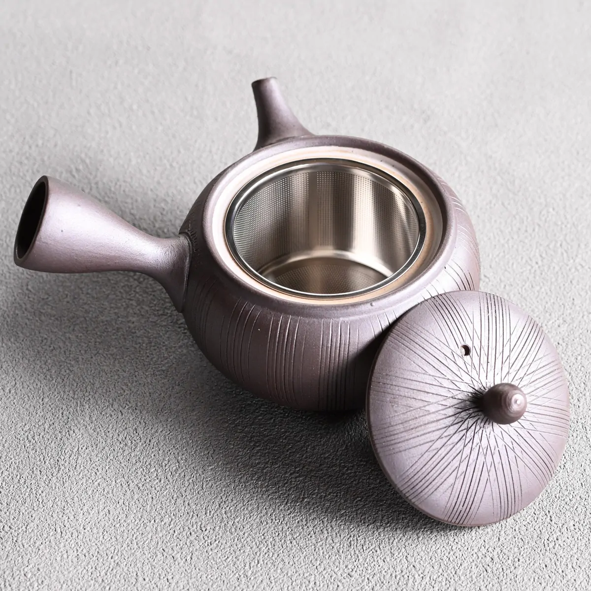 Side-handled teapot made from Tokoname clay with a removable metal strainer. The removable strainer makes the teapot easy to use and clean, and is especially ideal for deep-steamed green teas such as fukamushicha, which have finely cut leaves and more "tea dust".