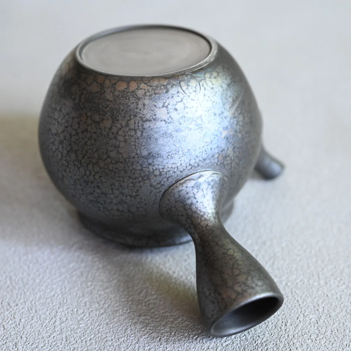 Tenmoku, or oil drop glaze is one of the most difficult glazes to make. In these pieces the oil drops are fainter and have slight imperfections. These anomalies do not effect the functionality of the teapot and have their own beauty. Since the tenmoku glaze is not flawless, we offer these teapots at a 10% discount.