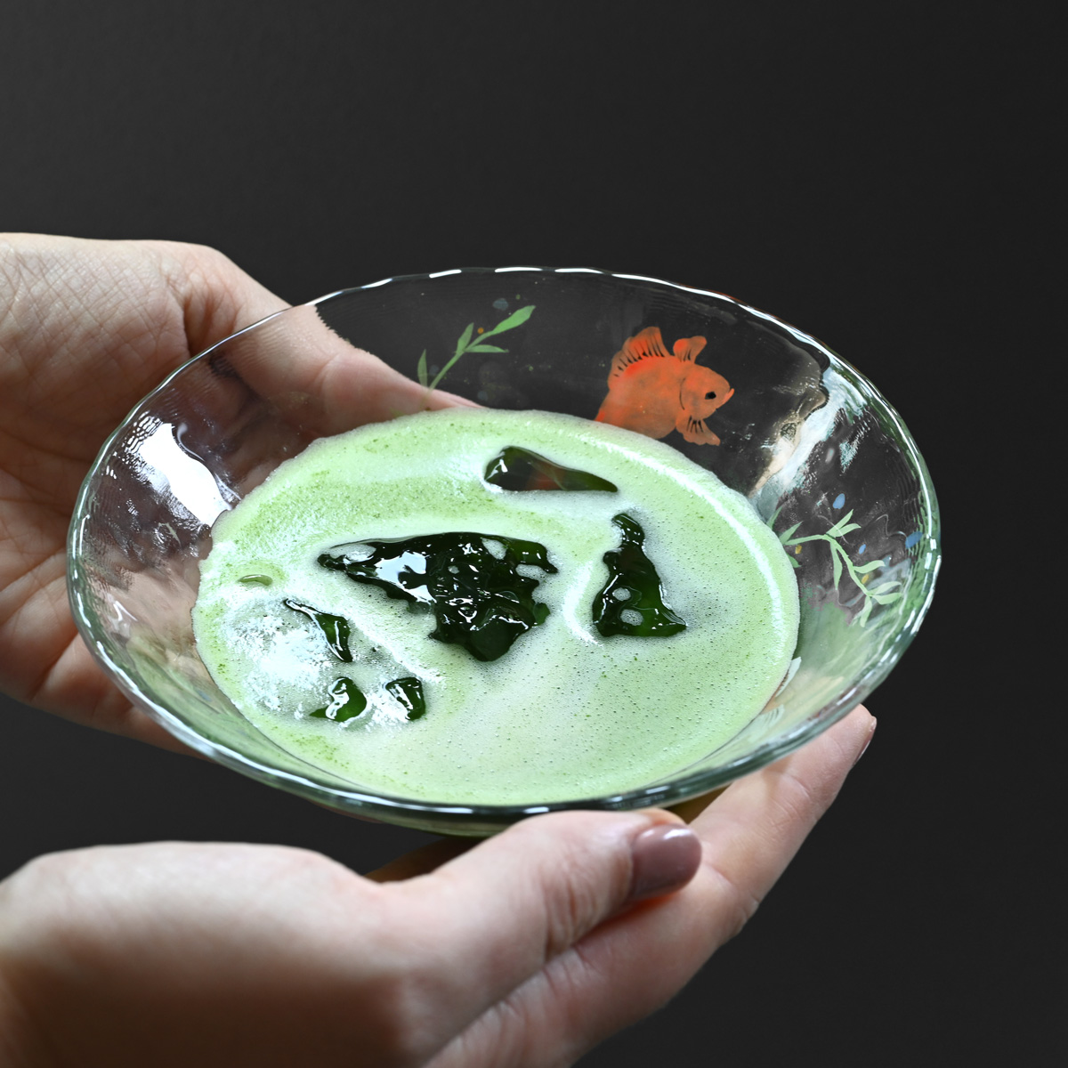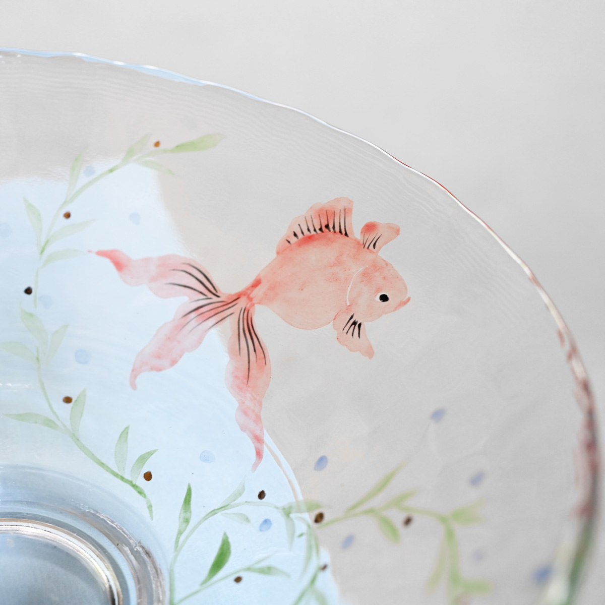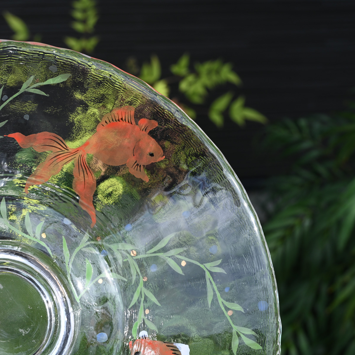 A lovely handmade and hand-painted tempered glass bowl decorated with koi fish. In Japan, during the summer, people often use items that creates a cool and calming atmosphere. Teaware decorated with gold fish is visually refreshing and also brings a sense of spiritual tranquility. The surface of the bowl resembles shimmering water, adding a playful and refreshing touch.