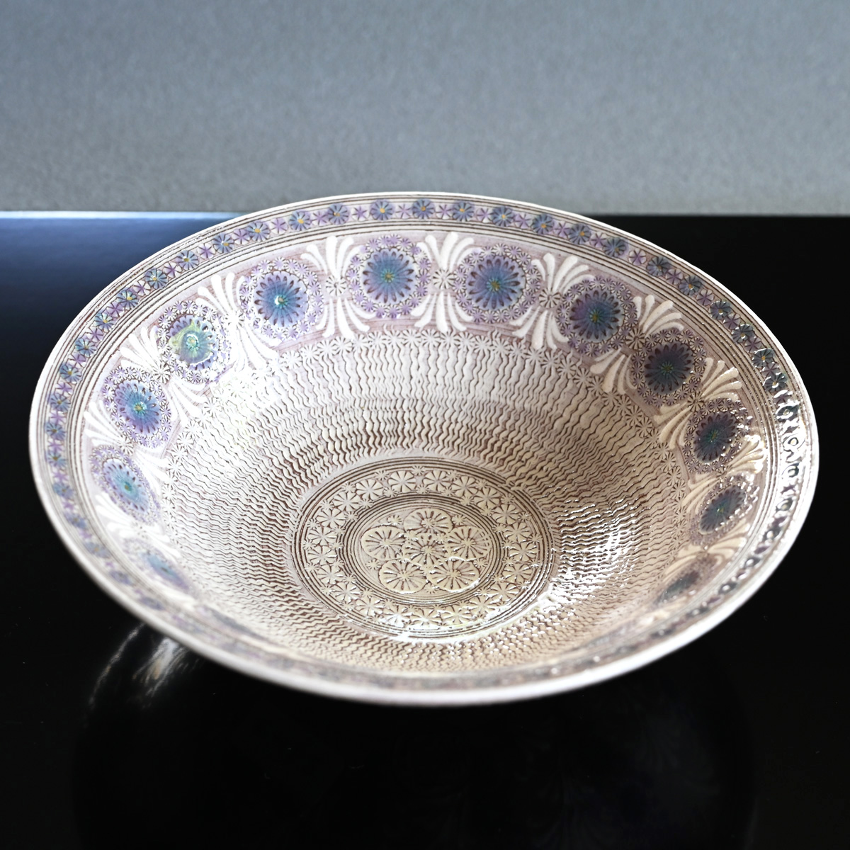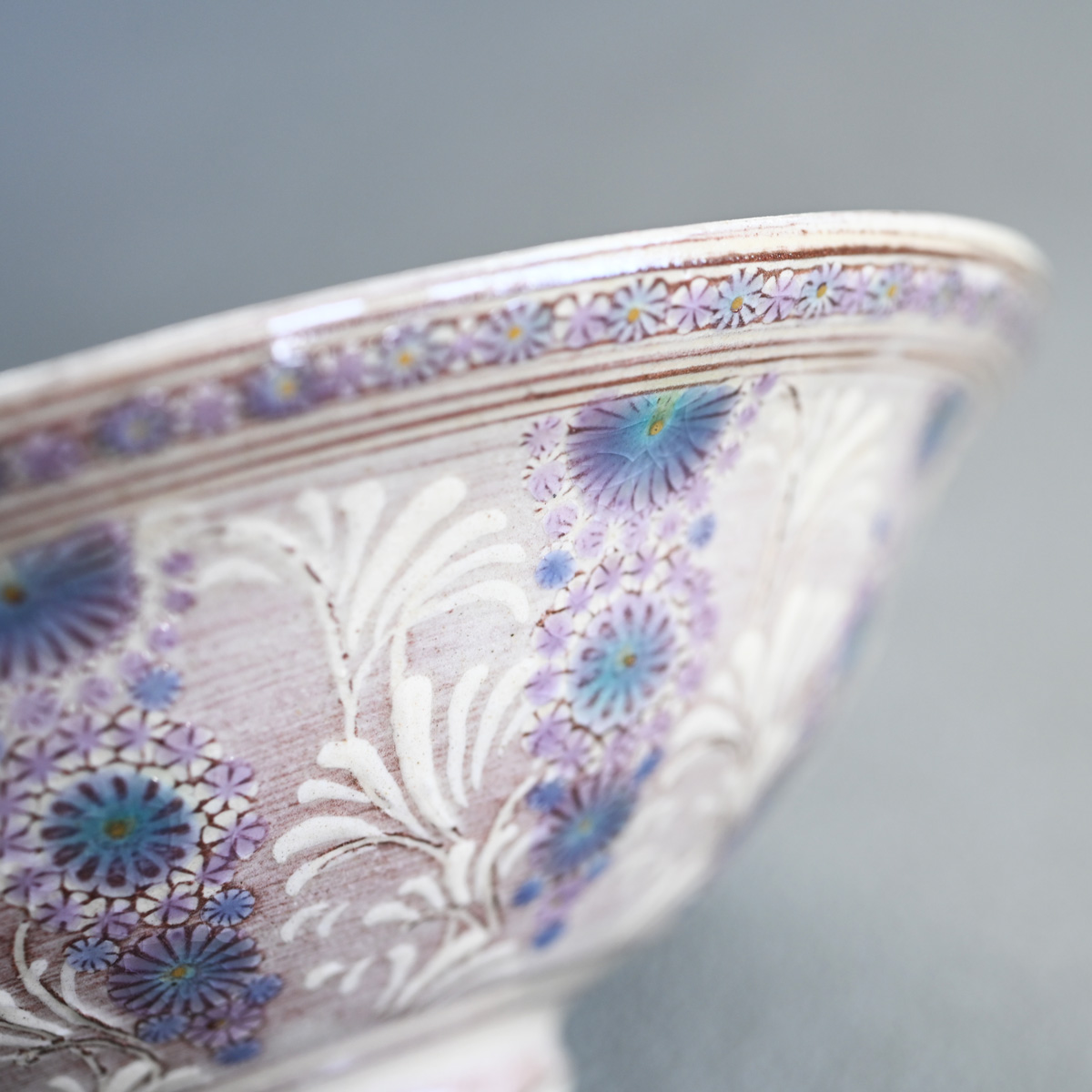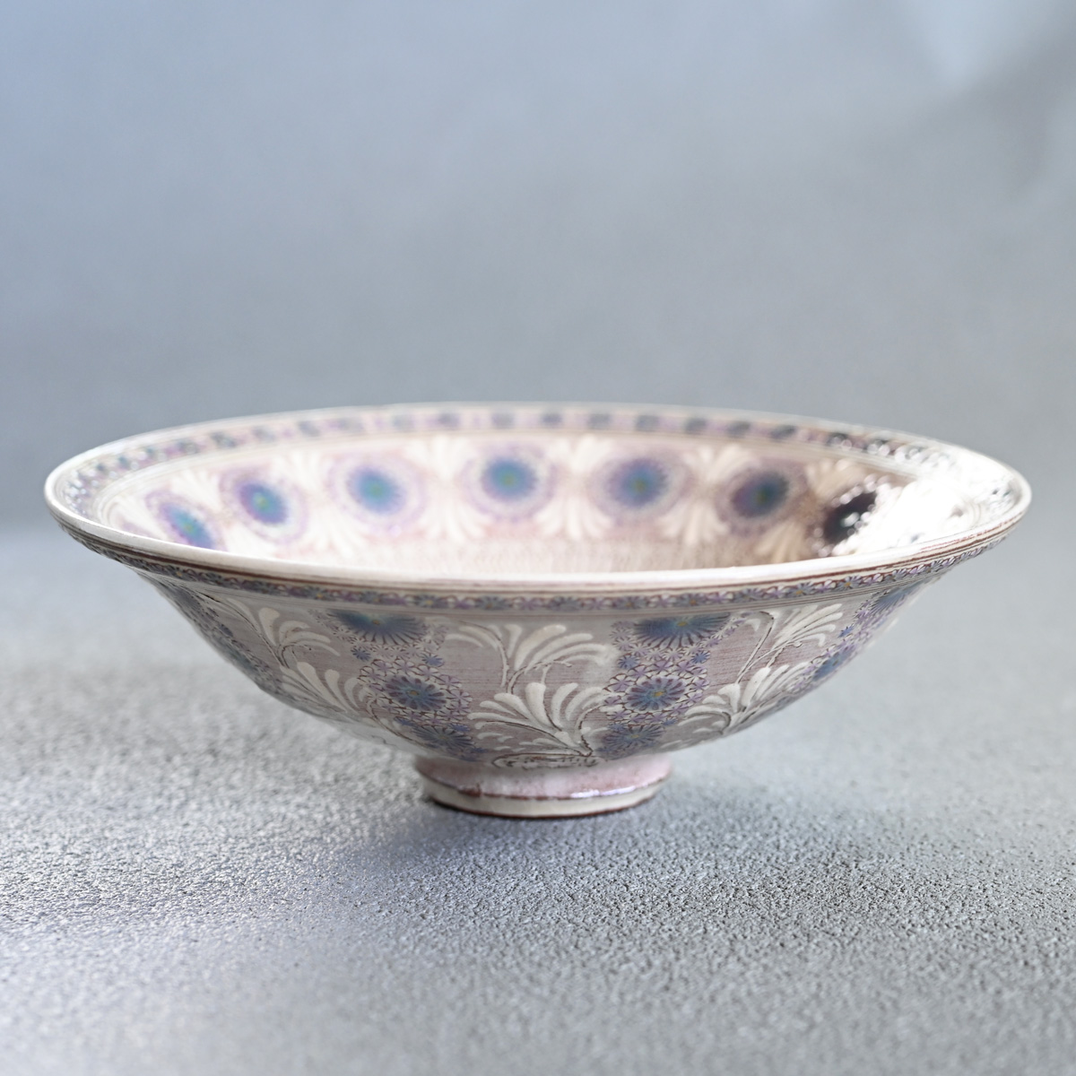 Hideo Morisato has developed a distinctive approach called “Murasaki Mishima” or “Shisaikamon,” named after the unique purple-hued clay used in their artworks. The designs are made with ceramic stamps, forming repeating patterns that give the piece a unique and dynamic look. Alongside the inlaid motifs, the bowl features “Ukihanamon”—bulging flower patterns—painted with white “Deisho” slip.