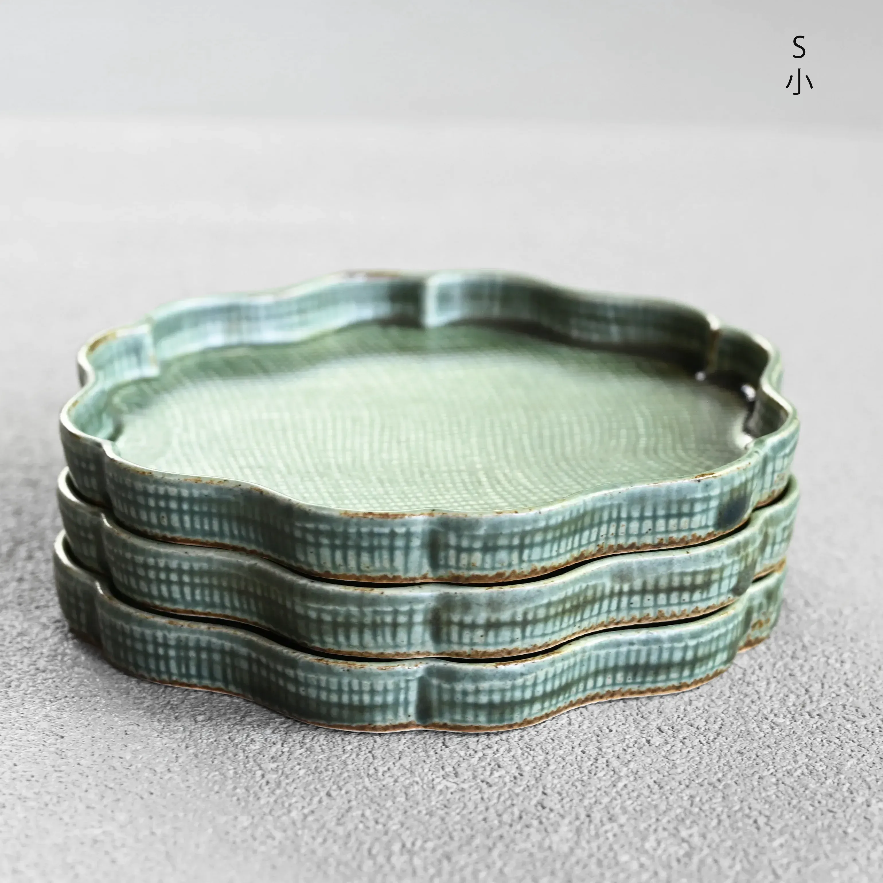 Flower-shaped white clay plate with a green glaze finish