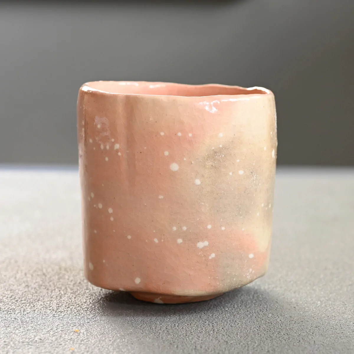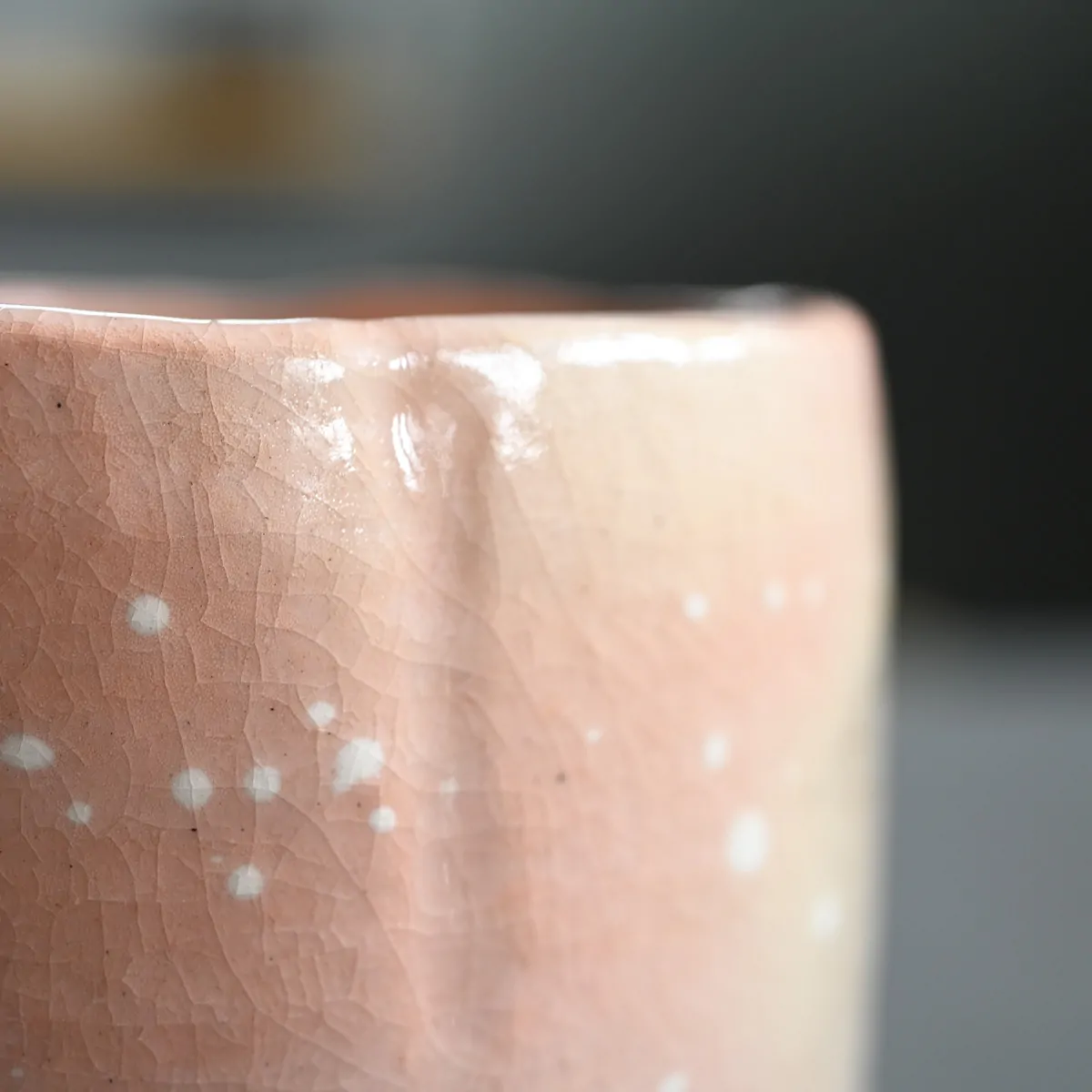 Raku tea bowl with tall walls and a soft peach hue. In Japan, tall “tsutsu” bowls are traditionally used to help keep matcha warm, especially on cold winter days. This chawan is decorated with hand-painted snowflake motifs.